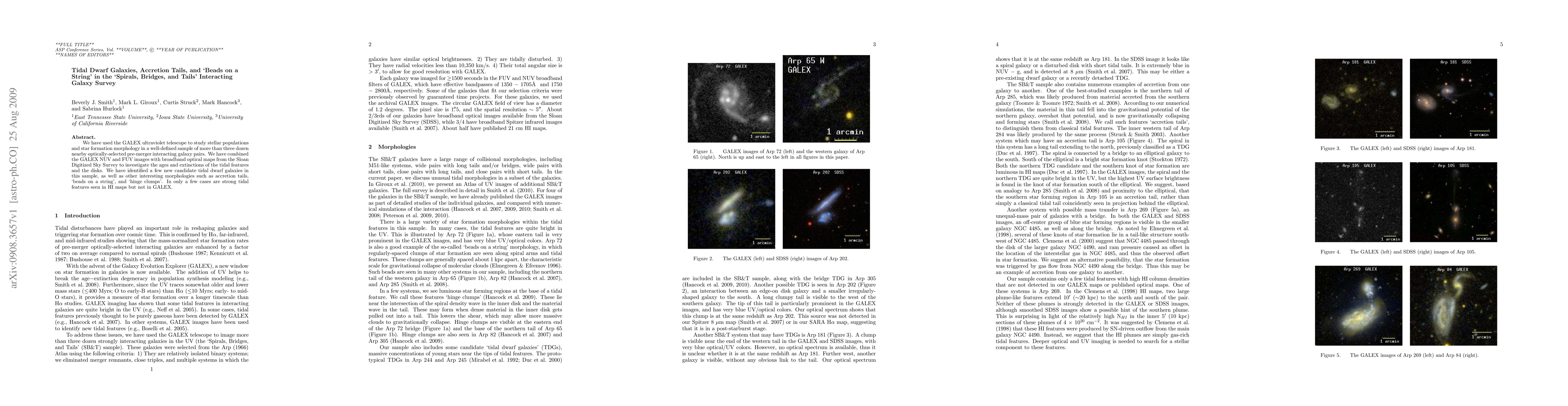 We have used the GALEX ultraviolet telescope to study stellar populations and star formation morphology in a well-defined sample of more than three dozen nearby optically-selected pre-merger interacting galaxy pairs. We have combined the GALEX NUV and FUV images with broadband optical maps from the Sloan Digitized Sky Survey to investigate the ages and extinctions of the tidal features and the disks. We have identified a few new candidate tidal dwarf galaxies in this sample, as well as other interesting morphologies such as accretion tails, `beads on a string', and `hinge clumps'. In only a few cases are strong tidal features seen in HI maps but not in GALEX.