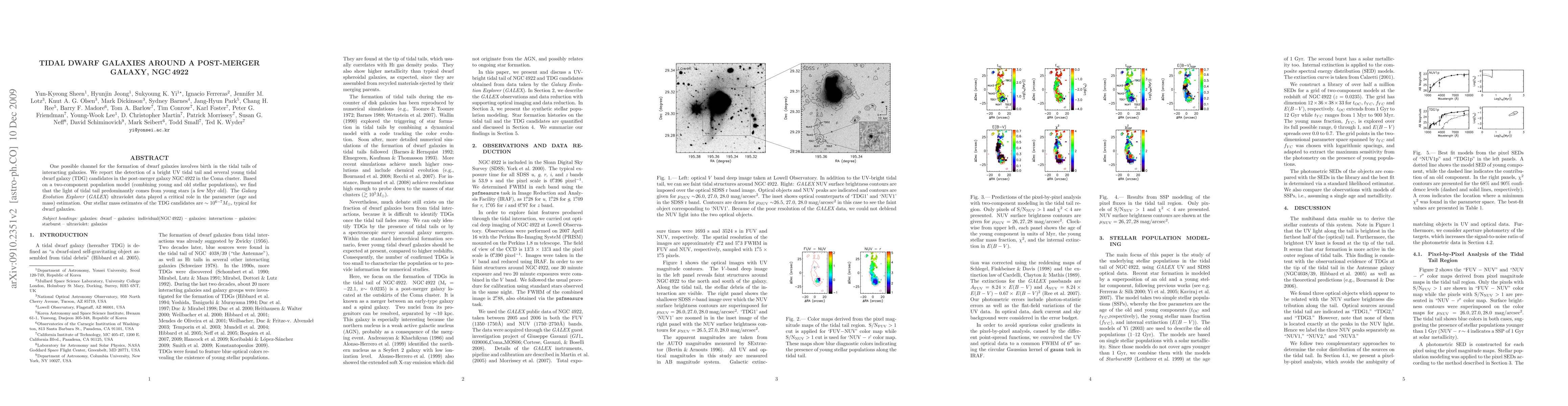One possible channel for the formation of dwarf galaxies involves birth in the tidal tails of interacting galaxies. We report the detection of a bright UV tidal tail and several young tidal dwarf galaxy candidates in the post-merger galaxy NGC 4922 in the Coma cluster. Based on a two-component population model (combining young and old stellar populations), we find that the light of tidal tail predominantly comes from young stars (a few Myr old). The Galaxy Evolution Explorer (GALEX) ultraviolet data played a critical role in the parameter (age and mass) estimation. Our stellar mass estimates of the tidal dwarf galaxy candidates are ~ 10^{6-7} M_sun, typical for dwarf galaxies.