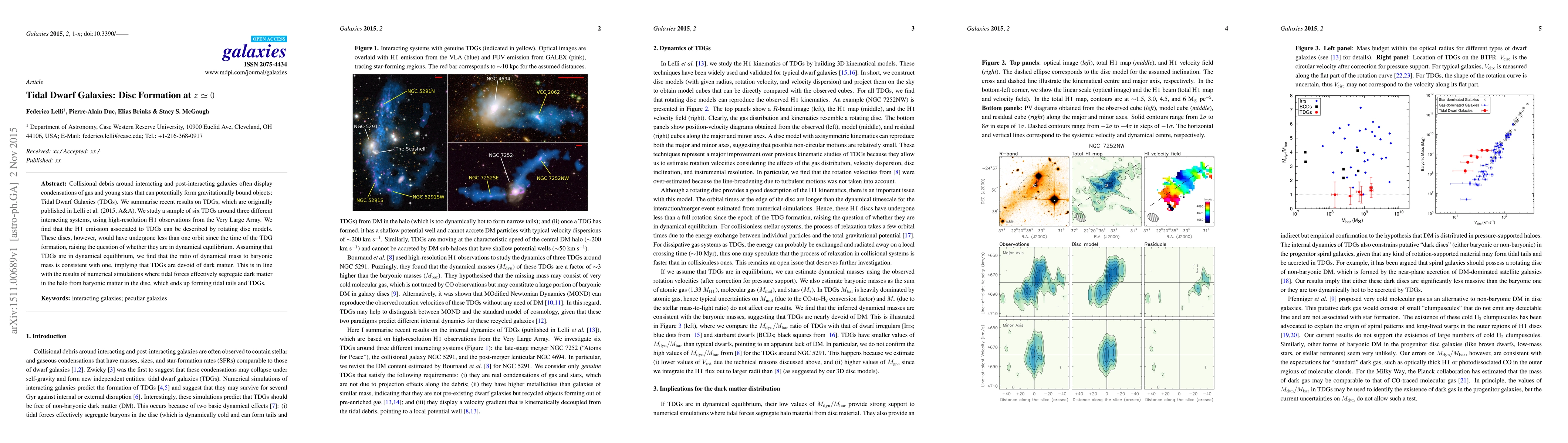 This paper summarizes findings on Tidal Dwarf Galaxies (TDGs) formed from gas and young stars in collisional debris around interacting galaxies, revealing that their HI emission forms rotating discs that likely underwent less than one orbit since formation. The study suggests TDGs are devoid of dark matter, consistent with numerical simulations showing tidal forces segregate dark matter from baryonic matter in TDG formation.