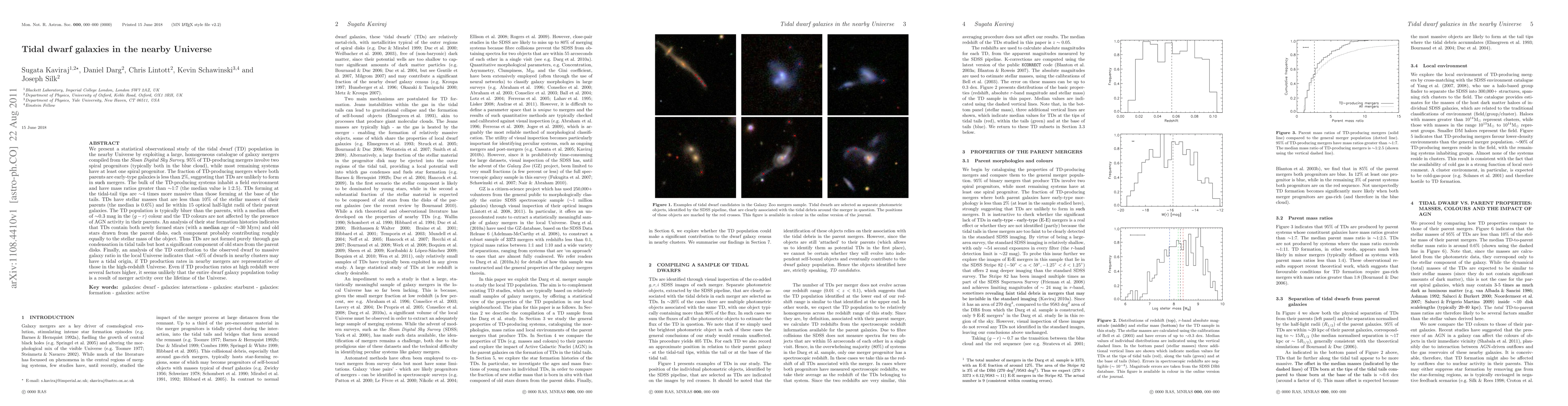 We present a statistical observational study of the tidal dwarf (TD) population in the nearby Universe, by exploiting a large, homogeneous catalogue of galaxy mergers compiled from the SDSS. 95% of TD-producing mergers involve two spiral progenitors, while most remaining systems have at least one spiral progenitor. The fraction of TD-producing mergers where both parents are early-type galaxies is <2%, suggesting that TDs are unlikely to form in such mergers. The bulk of TD-producing systems inhabit a field environment and have mass ratios greater than 1:7 (the median value is 1:2.5). TDs forming at the tidal-tail tips are ~4 times more massive than those forming at the base of the tails. TDs have stellar masses that are less than 10% of the stellar masses of their parents and typically lie within 15 optical half-light radii of their parent galaxies. The TD population is typically bluer than the parents, with a median offset of ~0.3 mag in the (g-r) colour and the TD colours are not affected by the presence of AGN activity in their parents. An analysis of their star formation histories indicates that TDs contain both newly formed stars (with a median age of ~30 Myr) and old stars drawn from the parent disks, each component probably contributing roughly equally to their stellar mass. Thus, TDs are not formed purely through gas condensation in tidal tails but host a significant component of old stars from the parent disks. Finally, an analysis of the TD contribution to the local dwarf-to-massive galaxy ratio indicates that ~6% of dwarfs in nearby clusters may have a tidal origin, if TD production rates in nearby mergers are representative of those in the high-redshift Universe. Even if TD production rates at high redshift were several factors higher, it seems unlikely that the entire dwarf galaxy population today is a result of merger activity over the lifetime of the Universe.