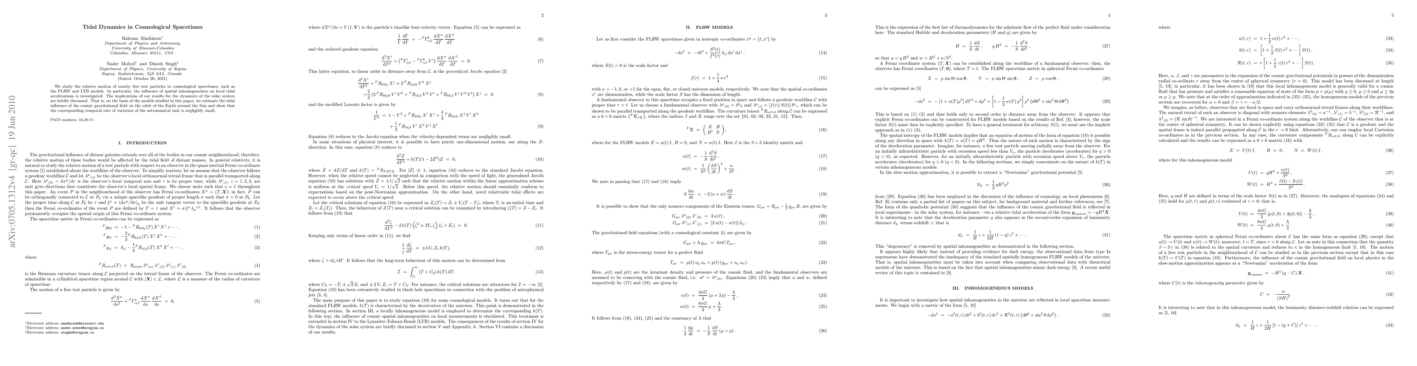 We study the relative motion of nearby free test particles in cosmological spacetimes, such as the FLRW and LTB models. In particular, the influence of spatial inhomogeneities on local tidal accelerations is investigated. The implications of our results for the dynamics of the solar system are briefly discussed. That is, on the basis of the models studied in this paper, we estimate the tidal influence of the cosmic gravitational field on the orbit of the Earth around the Sun and show that the corresponding temporal rate of variation of the astronomical unit is negligibly small.