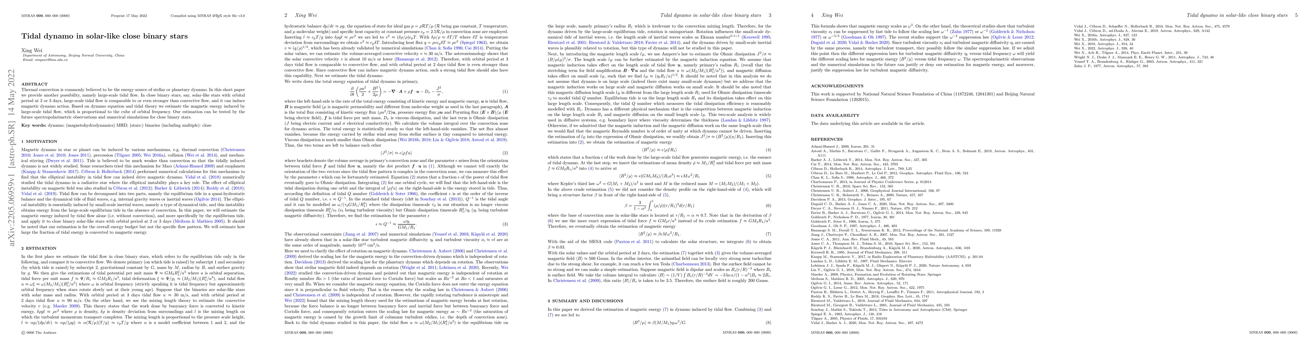 This paper explores the potential of large-scale tidal flow in close binary stars, such as solar-like stars with short orbital periods, to generate magnetic dynamo action, rivaling or surpassing thermal convection. The study estimates the magnetic energy induced by tidal flow, suggesting it could be verified through future observational and simulation efforts.