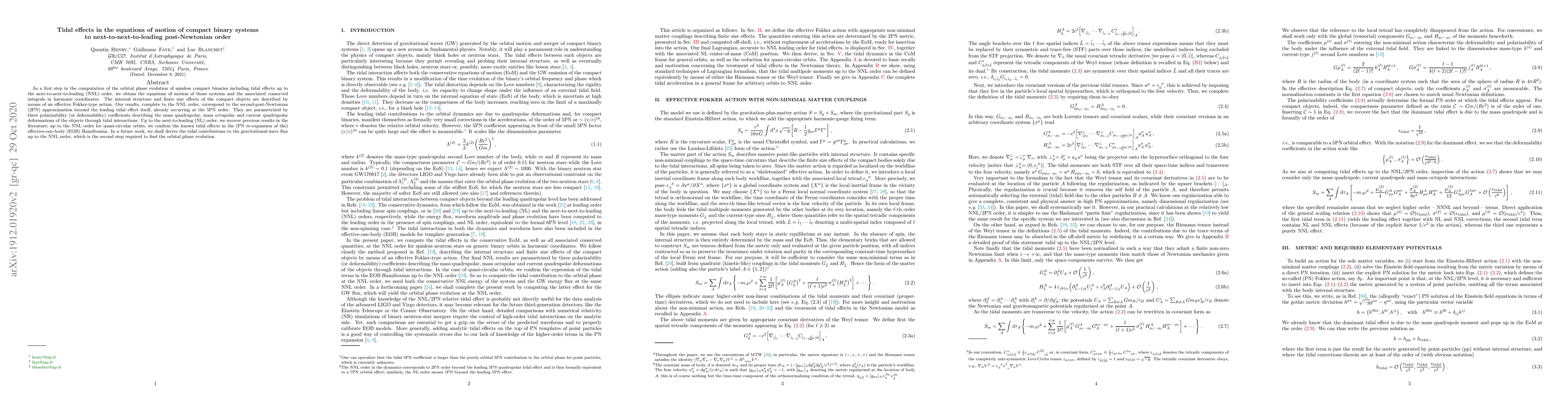 This paper computes the equations of motion for compact binary systems including tidal effects up to next-to-next-to-leading post-Newtonian order, describing the internal structure via an effective Fokker-type action. The results are parametrized by three polarizability coefficients and confirm known tidal effects in the effective-one-body Hamiltonian.