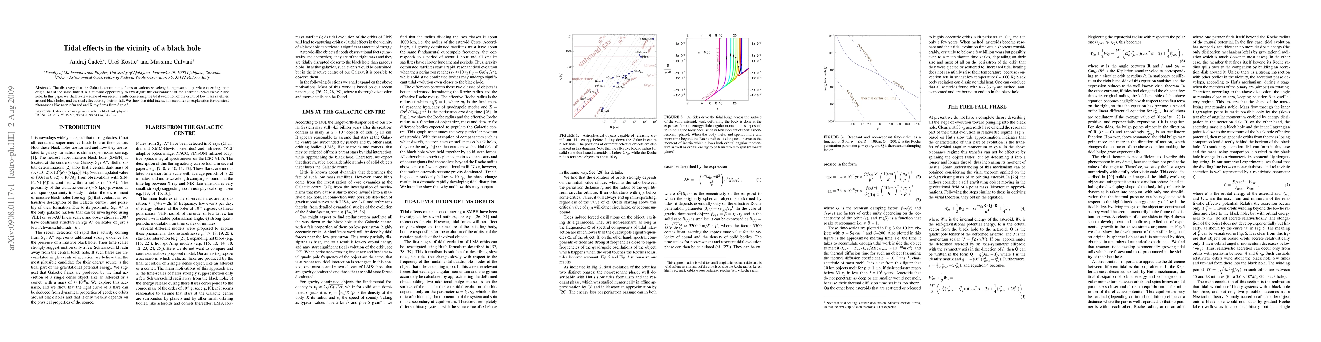 The discovery that the Galactic centre emits flares at various wavelengths represents a puzzle concerning their origin, but at the same time it is a relevant opportunity to investigate the environment of the nearest super-massive black hole. In this paper we shall review some of our recent results concerning the tidal evolution of the orbits of low mass satellites around black holes, and the tidal effect during their in-fall. We show that tidal interaction can offer an explanation for transient phenomena like near infra-red and X-ray flares from Sgr A*.