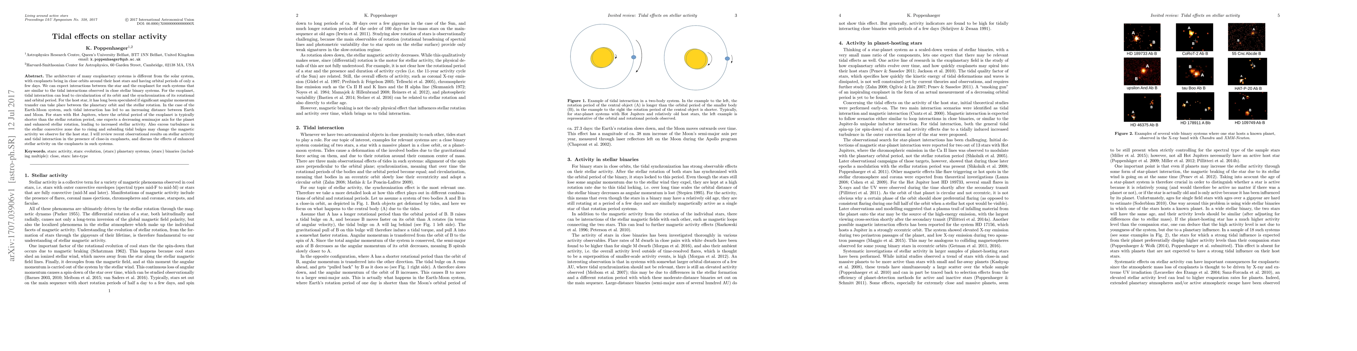 This paper reviews the tidal interactions between close-in exoplanets and their host stars, focusing on the resulting stellar activity and its implications. It highlights the potential for enhanced stellar rotation and magnetic activity due to angular momentum transfer from the planet, with significant effects on both the star and the exoplanet.