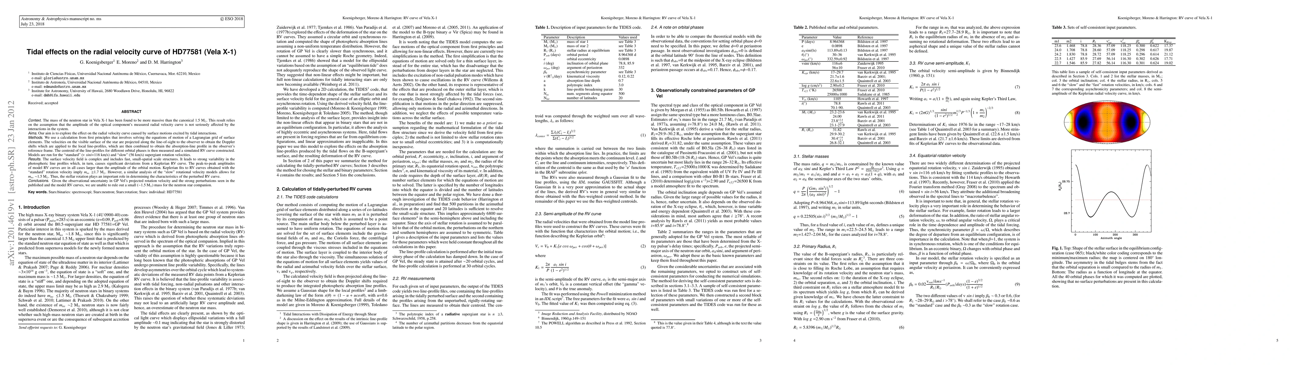 The mass of the neutron star in Vela X-1 has been found to be more massive than the canonical 1.5 Mo. This result relies on the assumption that the amplitude of the optical component's measured radial velocity curve is not seriously affected by the interactions in the system. In this paper we explore the effect on the radial velocity curve caused by surface motions excited by tidal interactions. We use a calculation from first principles that involves solving the equations of motion of a Lagrangian grid of surface elements. The velocities on the visible surface of the star are projected along the line-of-sight to the observer to obtain the absorption-line profile in the observer's reference frame. The centroid of the line-profiles for different orbital phases is then measured and a simulated RV curve constructed. Models are run for the "standard" (vsini=116 km/s) and "slow" (56 km/s) supergiant rotation velocities. We find that the surface velocity field is complex and includes fast, small-spatial scale structures. It leads to strong variability in the photospheric line profiles which, in turn, causes significant deviations from a Keplerian RV curve. The peak-to-peak amplitudes of model RV curves are in all cases larger than the amplitude of the orbital motion. Keplerian fits to RV curves obtained with the "standard" rotation velocity imply a neutron star >1.7 Mo. However, a similar analysis of the "slow" rotational velocity models allows for m_ns ~ 1.5 Mo. Thus, the stellar rotation plays an important role in determining the characteristics of the perturbed RV curve. Given the observational uncertainty in GP Vel's projected rotation velocity and the strong perturbations seen in the published and the model RV curves, we are unable to rule out a small (~1.5 Mo) mass for the neutron star companion.