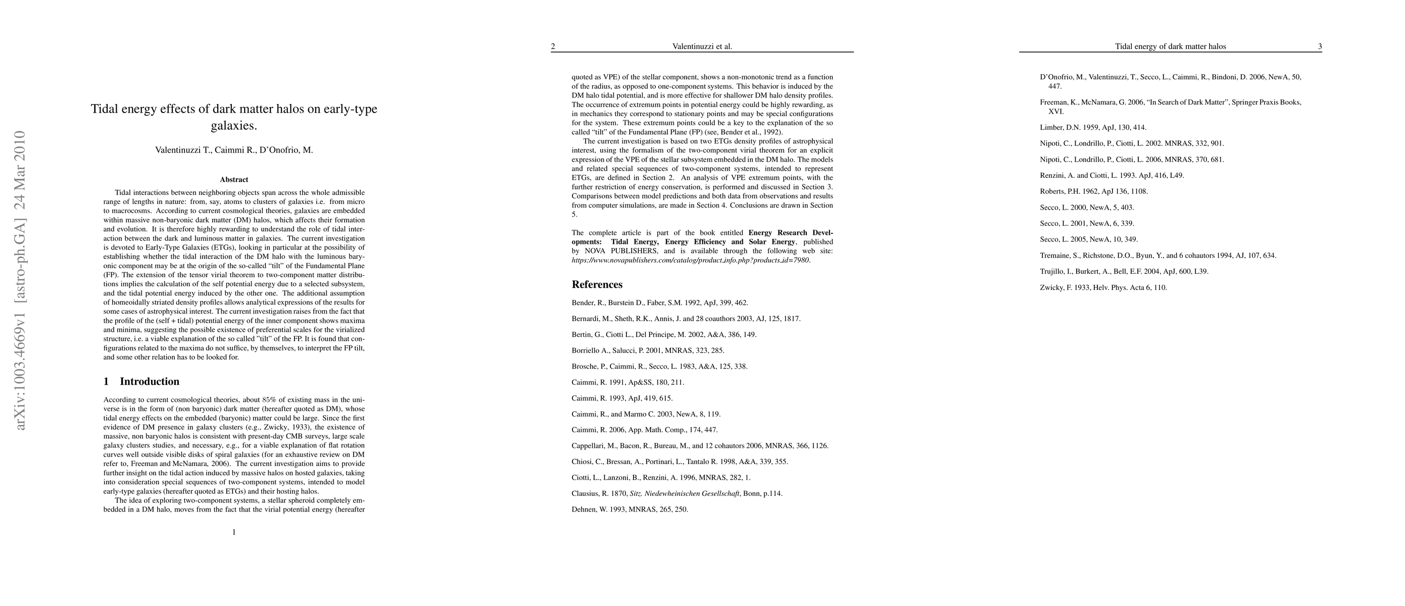 Tidal interactions between neighboring objects span across the whole admissible range of lengths in nature: from, say, atoms to clusters of galaxies i.e. from micro to macrocosms. According to current cosmological theories, galaxies are embedded within massive non-baryonic dark matter (DM) halos, which affects their formation and evolution. It is therefore highly rewarding to understand the role of tidal interaction between the dark and luminous matter in galaxies. The current investigation is devoted to Early-Type Galaxies (ETGs), looking in particular at the possibility of establishing whether the tidal interaction of the DM halo with the luminous baryonic component may be at the origin of the so-called "tilt" of the Fundamental Plane (FP). The extension of the tensor virial theorem to two-component matter distributions implies the calculation of the self potential energy due to a selected subsystem, and the tidal potential energy induced by the other one. The additional assumption of homeoidally striated density profiles allows analytical expressions of the results for some cases of astrophysical interest. The current investigation raises from the fact that the profile of the (self + tidal) potential energy of the inner component shows maxima and minima, suggesting the possible existence of preferential scales for the virialized structure, i.e. a viable explanation of the so called "tilt" of the FP. It is found that configurations related to the maxima do not suffice, by themselves, to interpret the FP tilt, and some other relation has to be looked for.