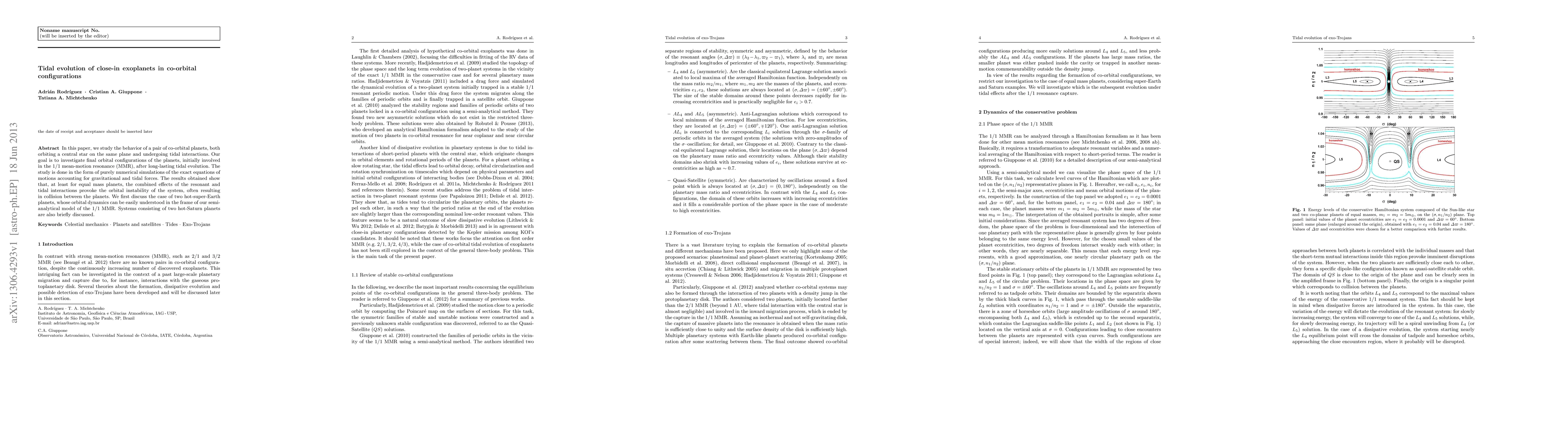 In this paper, we study the behavior of a pair of co-orbital planets, both orbiting a central star on the same plane and undergoing tidal interactions. Our goal is to investigate final orbital configurations of the planets, initially involved in the 1/1 mean-motion resonance (MMR), after long-lasting tidal evolution. The study is done in the form of purely numerical simulations of the exact equations of motions accounting for gravitational and tidal forces. The results obtained show that, at least for equal mass planets, the combined effects of the resonant and tidal interactions provoke the orbital instability of the system, often resulting in collision between the planets. We first discuss the case of two hot-super-Earth planets, whose orbital dynamics can be easily understood in the frame of our semi-analytical model of the 1/1 MMR. Systems consisting of two hot-Saturn planets are also briefly discussed.
