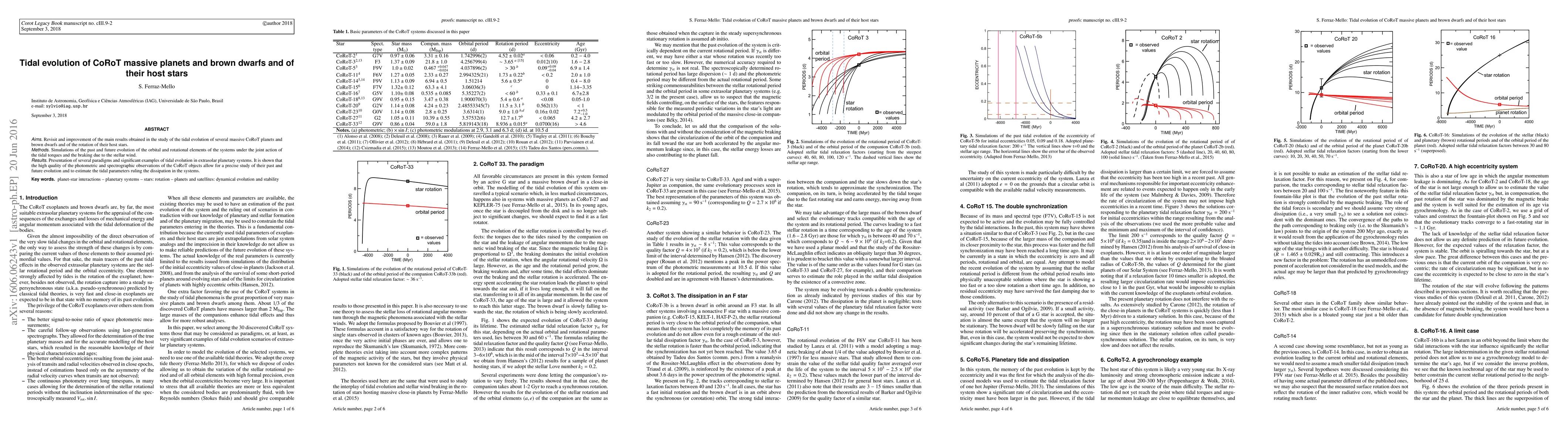 Aims: Revisit and improvement of the main results obtained in the study of the tidal evolution of several massive CoRoT planets and brown dwarfs and of the rotation of their host stars. Methods: Simulations of the past and future evolution of the orbital and rotational elements of the systems under the joint action of the tidal torques and the braking due to the stellar wind. Results: Presentation of several paradigms and significant examples of tidal evolution in extrasolar planetary systems. It is shown that the high quality of the photometric and spectrographic observations of the CoRoT objects allow for a precise study of their past and future evolution and to estimate the tidal parameters ruling the dissipation in the systems.
