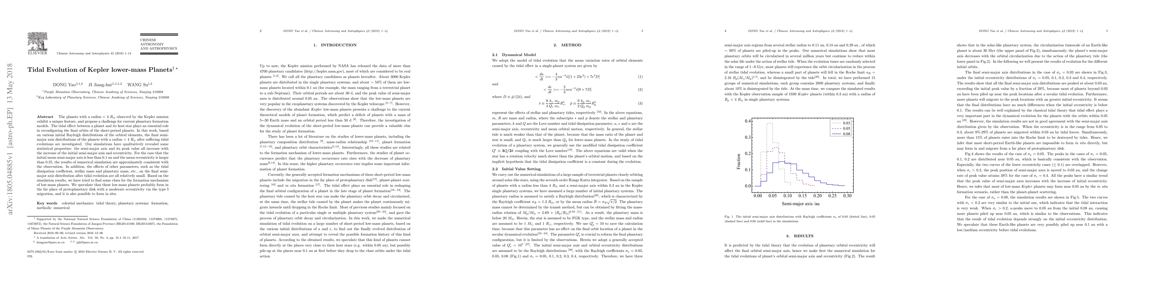 The planets with a radius $<$ 4 $R$$_\oplus$ observed by the Kepler mission exhibit a unique feature, and propose a challenge for current planetary formation models. The tidal effect between a planet and its host star plays an essential role in reconfiguring the final orbits of the short-period planets. In this work, based on various initial Rayleigh distributions of the orbital elements, the final semi-major axis distributions of the planets with a radius $<$ 4 $R_\oplus$ after suffering tidal evolutions are investigated. Our simulations have qualitatively revealed some statistical properties: the semi-major axis and its peak value all increase with the increase of the initial semi-major axis and eccentricity. For the case that the initial mean semi-major axis is less than 0.1 au and the mean eccentricity is larger than 0.25, the results of numerical simulation are approximately consistent with the observation. In addition, the effects of other parameters, such as the tidal dissipation coefficient, stellar mass and planetary mass, etc., on the final semi-major axis distribution after tidal evolution are all relatively small. Based on the simulation results, we have tried to find some clues for the formation mechanism of low-mass planets. We speculate that these low-mass planets probably form in the far place of protoplanetary disk with a moderate eccentricity via the type I migration, and it is also possible to form in situ.
