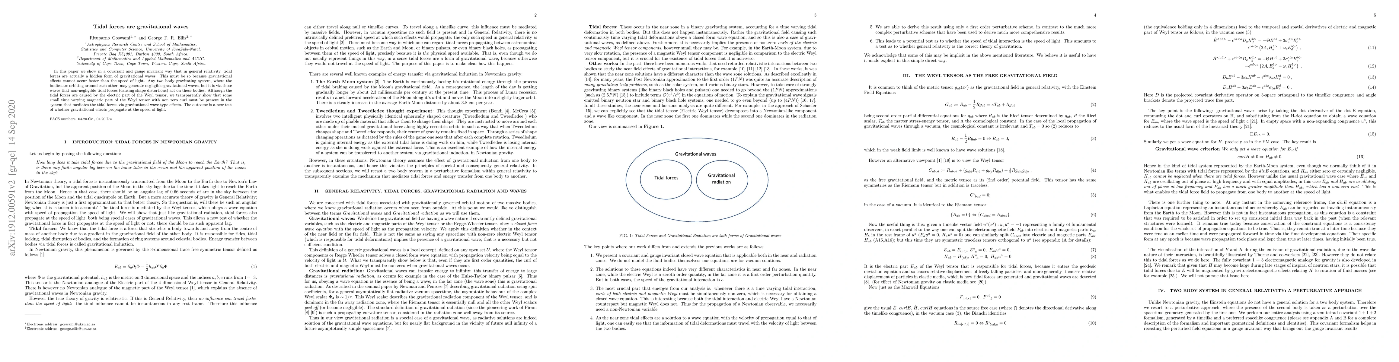 In this paper we show in a covariant and gauge invariant way that in general relativity, tidal forces are actually a hidden form of gravitational waves. This must be so because gravitational effects cannot occur faster than the speed of light. Any two body gravitating system, where the bodies are orbiting around each other, may generate negligible gravitational waves, but it is via these waves that non-negligible tidal forces (causing shape distortions) act on these bodies. Although the tidal forces are caused by the electric part of the Weyl tensor, we transparently show that some small time varying magnetic part of the Weyl tensor with non zero curl must be present in the system that mediates the tidal forces via gravitational wave type effects. The outcome is a new test of whether gravitational effects propagate at the speed of light.