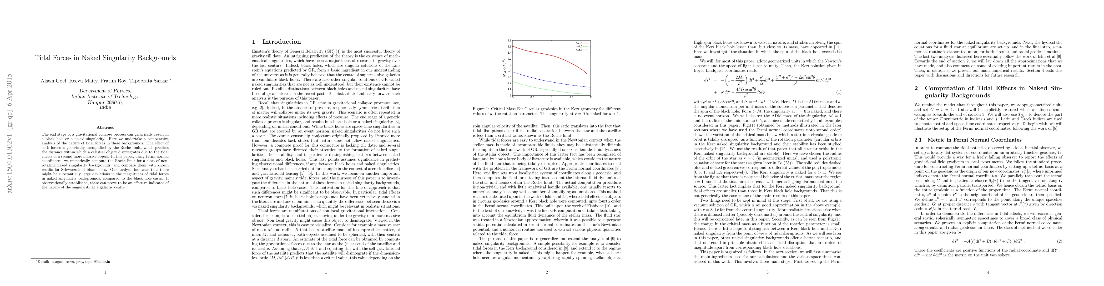 The end stage of a gravitational collapse process can generically result in a black hole or a naked singularity. Here we undertake a comparative analysis of the nature of tidal forces in these backgrounds. The effect of such forces is generically exemplified by the Roche limit, which predicts the distance within which a celestial object disintegrates due to the tidal effects of a second more massive object. In this paper, using Fermi normal coordinates, we numerically compute the Roche limit for a class of non-rotating naked singularity backgrounds, and compare them with known results for Schwarzschild black holes. Our analysis indicates that there might be substantially large deviations in the magnitudes of tidal forces in naked singularity backgrounds, compared to the black hole cases. If observationally established, these can prove to be an effective indicator of the nature of the singularity at a galactic centre.
