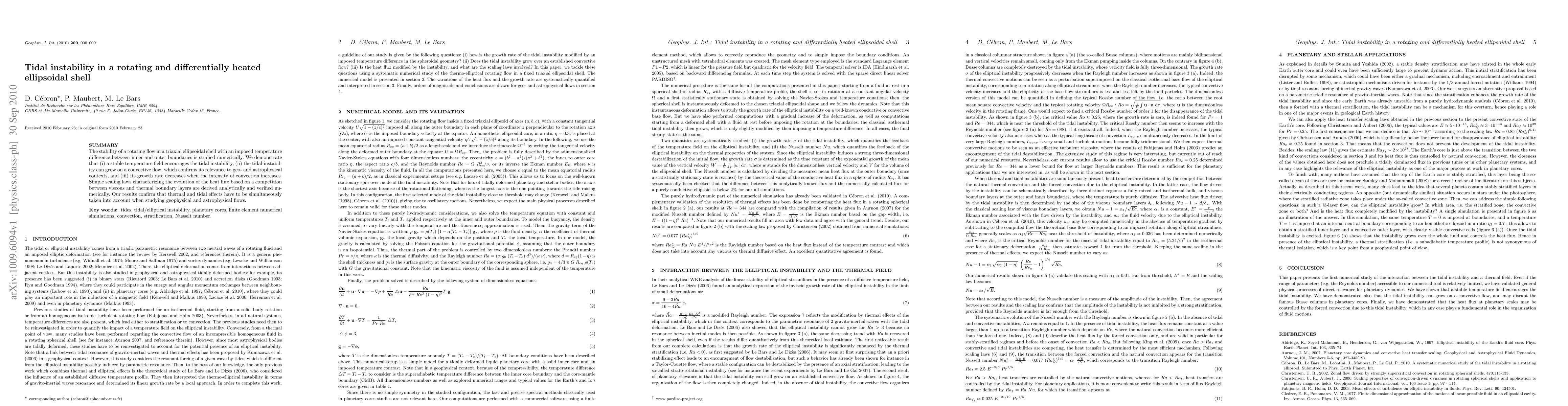 Researchers studied tidal instability in a rotating shell with temperature differences and found that stable temperature fields can trigger tidal instability, which grows on convective flows and decreases with increasing convection intensity.