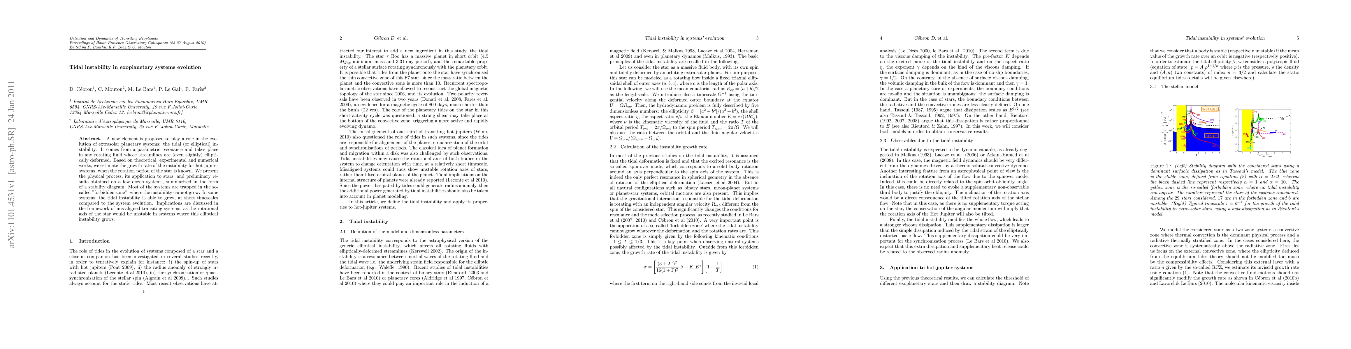 A new element is proposed to play a role in the evolution of extrasolar planetary systems: the tidal (or elliptical) instability. It comes from a parametric resonance and takes place in any rotating fluid whose streamlines are (even slightly) elliptically deformed. Based on theoretical, experimental and numerical works, we estimate the growth rate of the instability for hot-jupiter systems, when the rotation period of the star is known. We present the physical process, its application to stars, and preliminary results obtained on a few dozen systems, summarized in the form of a stability diagram. Most of the systems are trapped in the so-called "forbidden zone", where the instability cannot grow. In some systems, the tidal instability is able to grow, at short timescales compared to the system evolution. Implications are discussed in the framework of mis-aligned transiting systems, as the rotational axis of the star would be unstable in systems where this elliptical instability grows.