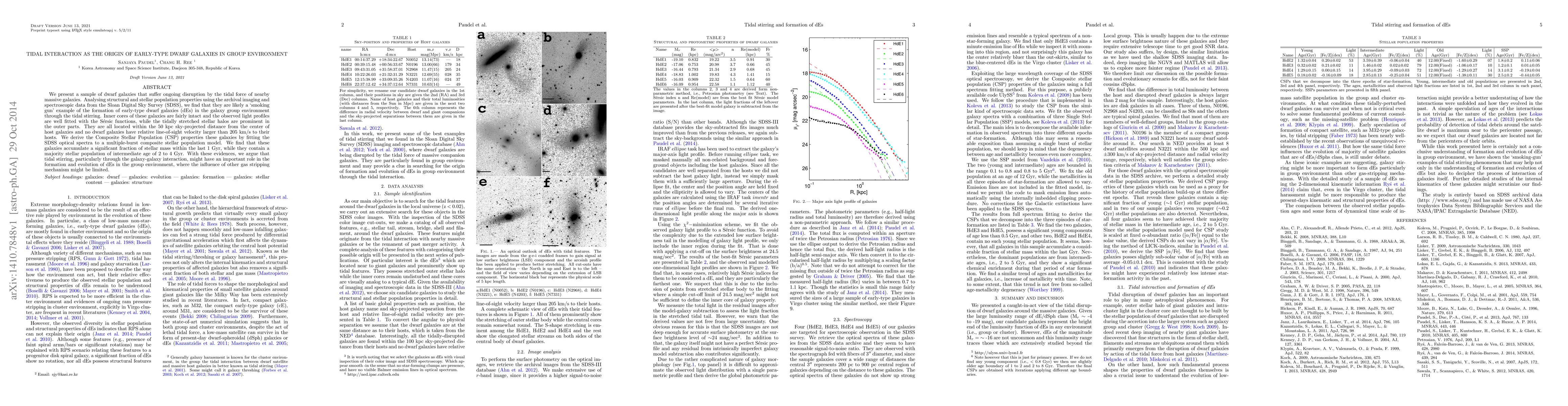This paper investigates dwarf galaxies experiencing tidal disruption by nearby massive galaxies, finding they exhibit characteristics of early-type dwarf galaxies formed through tidal stirring. The galaxies show intact cores and prominent tidally stretched stellar halos, suggesting significant recent star formation and an evolution driven by galaxy-galaxy interactions rather than gas stripping.