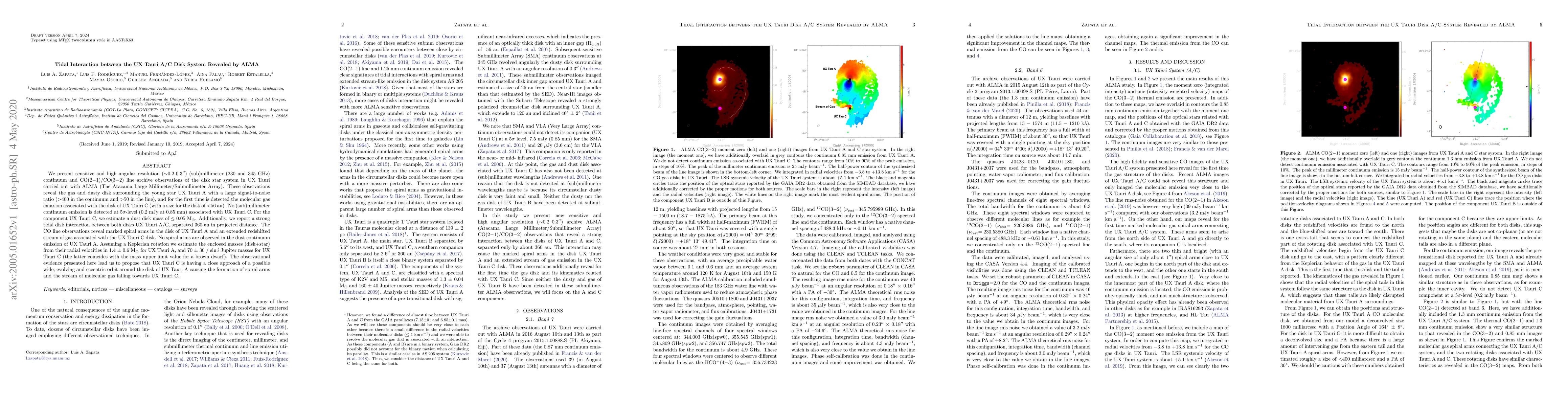 We present sensitive and high angular resolution ($\sim$0.2-0.3$''$) (sub)millimeter (230 and 345 GHz) continuum and CO(2$-$1)/CO(3$-$2) line archive observations of the disk star system in UX Tauri carried out with ALMA (The Atacama Large Millimeter/Submillimeter Array). These observations reveal the gas and dusty disk surrounding the young star UX Tauri A with a large signal-to-noise ratio ($>$400 in the continuum and $>$50 in the line), and for the first time is detected the molecular gas emission associated with the disk of UX Tauri C (with a size for the disk of $<$56 au). No (sub)millimeter continuum emission is detected at 5$\sigma$-level (0.2 mJy at 0.85 mm) associated with UX Tauri C. For the component UX Tauri C, we estimate a dust disk mass of $\leq$ 0.05 M$_\oplus$. Additionally, we report a strong tidal disk interaction between both disks UX Tauri A/C, separated 360 au in projected distance. The CO line observations reveal marked spiral arms in the disk of UX Tauri A and an extended redshifted stream of gas associated with the UX Tauri C disk. No spiral arms are observed in the dust continuum emission of UX Tauri A. Assuming a Keplerian rotation we estimate the enclosed masses (disk$+$star) from their radial velocities in 1.4 $\pm$ 0.6 M$_\odot$ for UX Tauri A, and 70 $\pm$ 30 / $\sin i$ Jupiter masses for UX Tauri C (the latter coincides with the mass upper limit value for a brown dwarf). The observational evidence presented here lead us to propose that UX Tauri C is having a close approach of a possible wide, evolving and eccentric orbit around the disk of UX Tauri A causing the formation of spiral arms and the stream of molecular gas falling towards UX Tauri C.