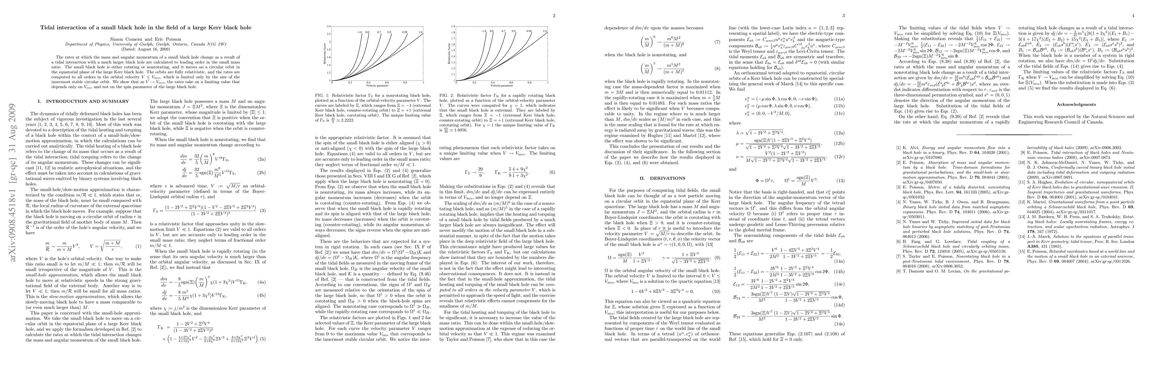 This paper calculates the tidal interaction rates affecting a small black hole orbiting a much larger Kerr black hole, determining changes in mass and angular momentum to leading order in the mass ratio. The study considers both rotating and nonrotating small black holes on relativistic circular orbits, with results valid for velocities below the innermost stable circular orbit, showing that as the velocity approaches this limit, the rates depend only on the large black hole's size.