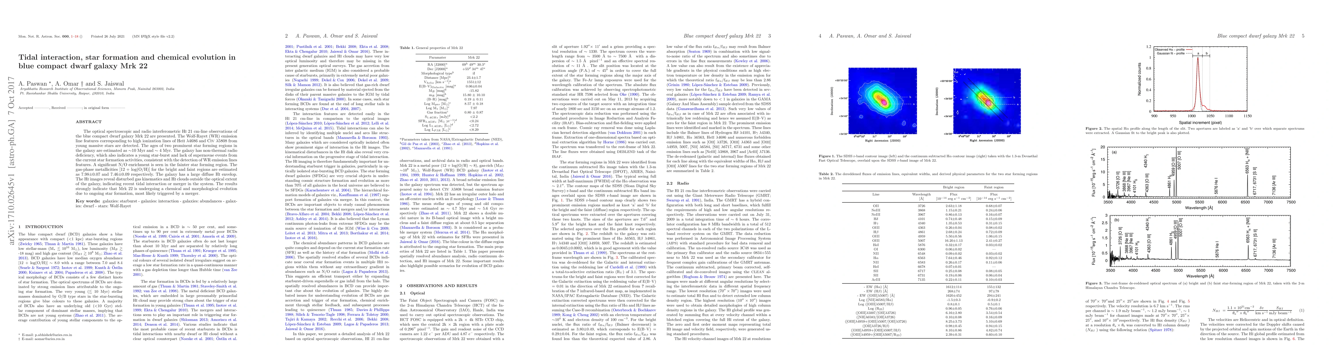 The optical spectroscopic and radio interferometric HI 21 cm-line observations of the blue compact dwarf galaxy Mrk 22 are presented. The Wolf-Rayet (WR) emission line features corresponding to high ionization lines of HeII $\lambda$4686 and CIV $\lambda$5808 from young massive stars are detected. The ages of two prominent star forming regions in the galaxy are estimated as $\sim$10 Myr and $\sim$ 4 Myr. The galaxy has non-thermal radio deficiency, which also indicates a young star-burst and lack of supernovae events from the current star formation activities, consistent with the detection of WR emission lines features. A significant N/O enrichment is seen in the fainter star forming region. The gas-phase metallicities [12 + log(O/H)] for the bright and faint regions are estimated as 7.98$\pm$0.07 and 7.46$\pm$0.09 respectively. The galaxy has a large diffuse HI envelop. The HI images reveal disturbed gas kinematics and HI clouds outside the optical extent of the galaxy, indicating recent tidal interaction or merger in the system. The results strongly indicate that Mrk 22 is undergoing a chemical and morphological evolution due to ongoing star formation, most likely triggered by a merger.