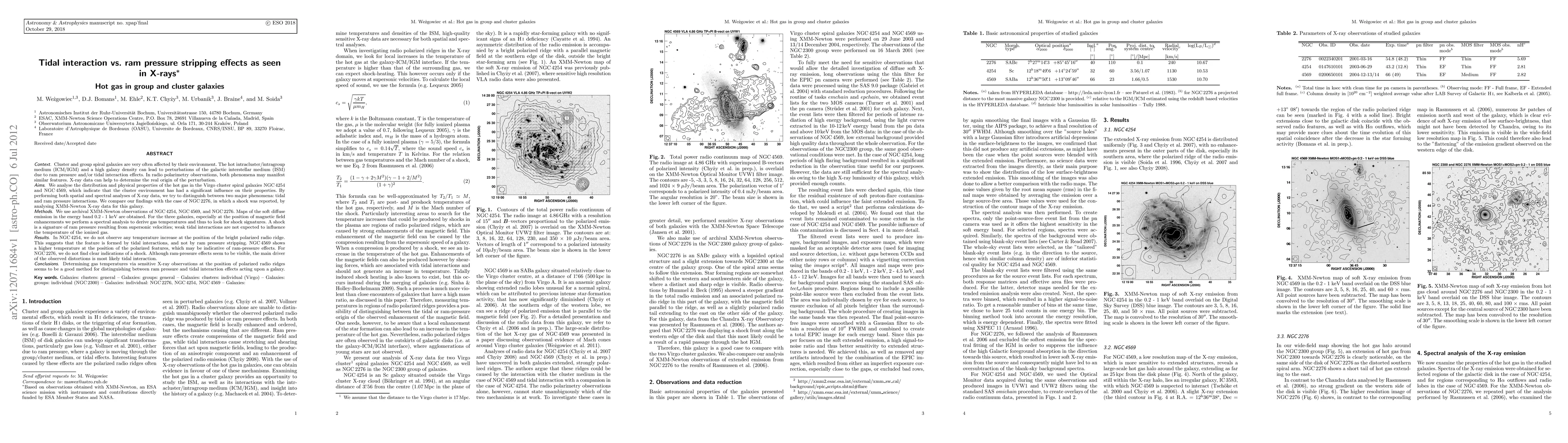 This study uses X-ray data to distinguish between tidal interaction and ram pressure stripping effects in galaxies NGC 4254, NGC 4569, and NGC 2276 within the Virgo cluster. The analysis reveals that tidal interactions likely dominate in NGC 4254, while NGC 4569 shows signs of ram pressure effects, highlighting the utility of X-ray temperature measurements in identifying the nature of environmental perturbations.