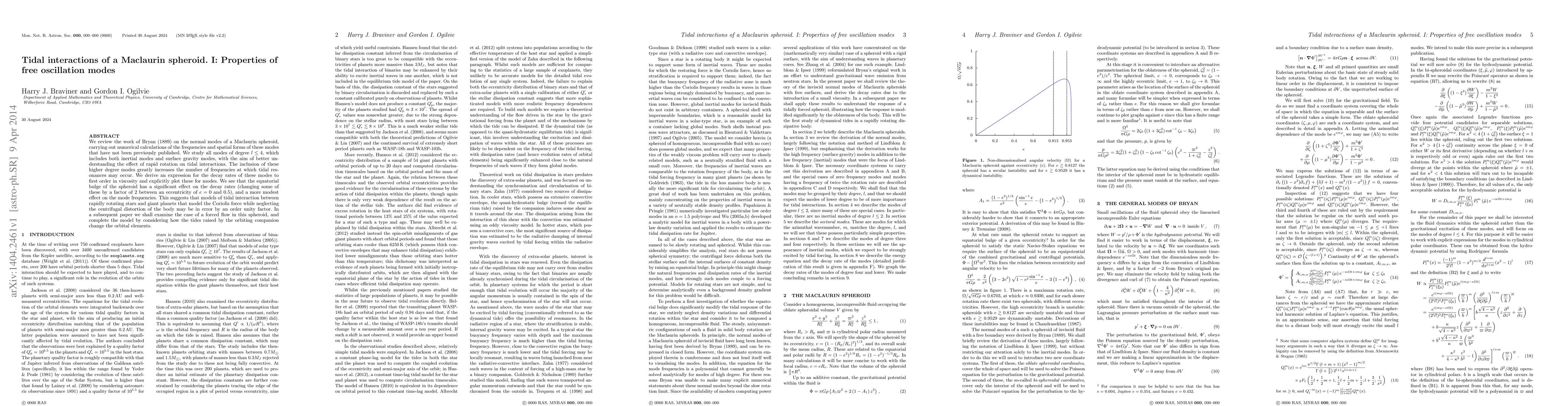 We review the work of Bryan (1889) on the normal modes of a Maclaurin spheroid, carrying out numerical calculations of the frequencies and spatial forms of these modes that have not been previously published. We study all modes of degree $l \le 4$, which includes both inertial modes and surface gravity modes, with the aim of better understanding the effect of rapid rotation on tidal interactions. The inclusion of these higher degree modes greatly increases the number of frequencies at which tidal resonances may occur. We derive an expression for the decay rates of these modes to first order in viscosity and explicitly plot these for modes. We see that the equatorial bulge of the spheroid has a significant effect on the decay rates (changing some of these by a factor of 2 between an eccentricity of $e=0$ and $0.5$), and a more modest effect on the mode frequencies. This suggests that models of tidal interaction between rapidly rotating stars and giant planets that model the Coriolis force while neglecting the centrifugal distortion of the body may be in error by an order unity factor. In a subsequent paper we shall examine the case of a forced flow in this spheroid, and complete the model by considering how the tides raised by the orbiting companion change the orbital elements.