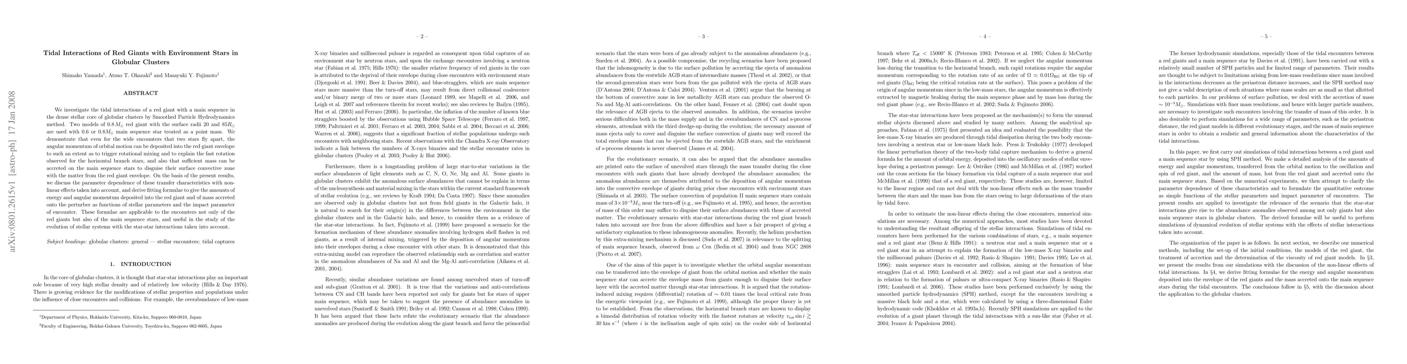 We investigate the tidal interactions of a red giant with a main sequence in the dense stellar core of globular clusters by Smoothed Particle Hydrodynamics method. Two models of $0.8 \msun$ red giant with the surface radii 20 and $85 R_\sun$ are used with 0.6 or $0.8M_\sun$ main sequence star treated as a point mass. We demonstrate that even for the wide encounters that two stars fly apart, the angular momentum of orbital motion can be deposited into the red giant envelope to such an extent as to trigger rotational mixing and to explain the fast rotation observed for the horizontal branch stars, and also that sufficient mass can be accreted on the main sequence stars to disguise their surface convective zone with the matter from the red giant envelope. On the basis of the present results, we discuss the parameter dependence of these transfer characteristics with non-linear effects taken into account, and derive fitting formulae to give the amounts of energy and angular momentum deposited into the red giant and of mass accreted onto the perturber as functions of stellar parameters and the impact parameter of encounter. These formulae are applicable to the encounters not only of the red giants but also of the main sequence stars, and useful in the study of the evolution of stellar systems with the star-star interactions taken into account.
