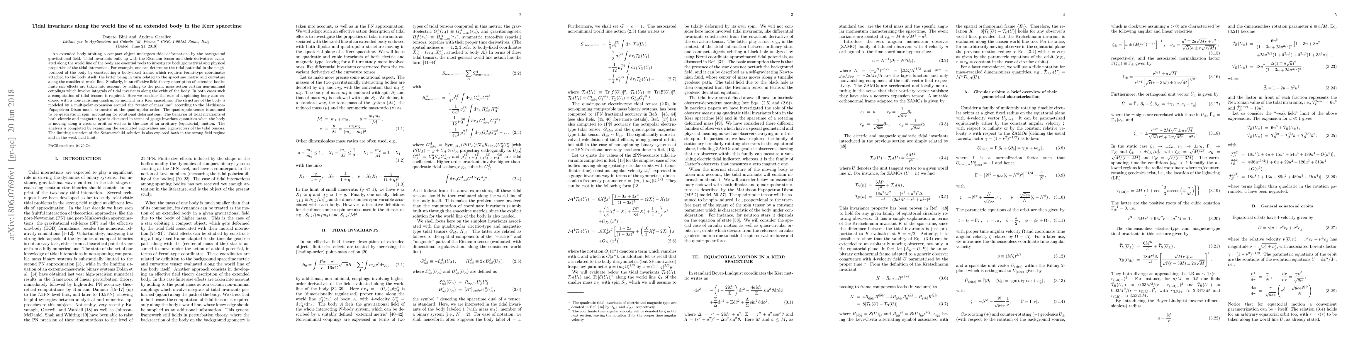 An extended body orbiting a compact object undergoes tidal deformations by the background gravitational field. Tidal invariants built up with the Riemann tensor and their derivatives evaluated along the world line of the body are essential tools to investigate both geometrical and physical properties of the tidal interaction. For example, one can determine the tidal potential in the neighborhood of the body by constructing a body-fixed frame, which requires Fermi-type coordinates attached to the body itself, the latter being in turn related to the spacetime metric and curvature along the considered world line. Similarly, in an effective field theory description of extended bodies finite size effects are taken into account by adding to the point mass action certain non-minimal couplings which involve integrals of tidal invariants along the orbit of the body. In both cases such a computation of tidal tensors is required. Here we consider the case of a spinning body also endowed with a non-vanishing quadrupole moment in a Kerr spacetime. The structure of the body is modeled by a multipolar expansion around the "center of mass line" according to the Mathisson-Papapetrou-Dixon model truncated at the quadrupolar order. The quadrupole tensor is assumed to be quadratic in spin, accounting for rotational deformations. The behavior of tidal invariants of both electric and magnetic type is discussed in terms of gauge-invariant quantities when the body is moving along a circular orbit as well as in the case of an arbitrary (equatorial) motion. The analysis is completed by examining the associated eigenvalues and eigenvectors of the tidal tensors. The limiting situation of the Schwarzschild solution is also explored both in the strong field regime and in the weak field limit.