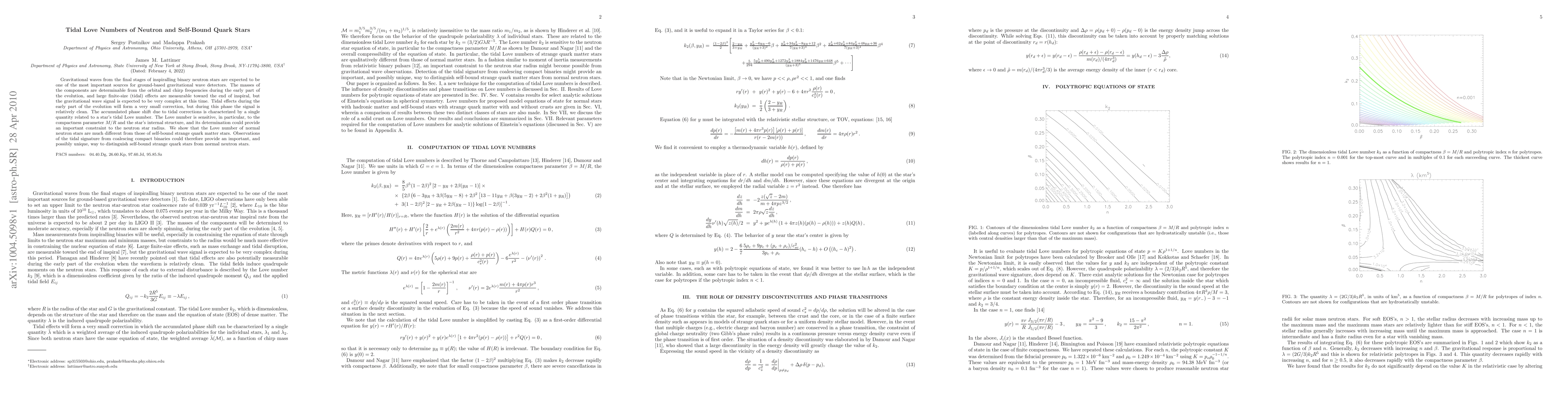 Gravitational waves from the final stages of inspiralling binary neutron stars are expected to be one of the most important sources for ground-based gravitational wave detectors. The masses of the components are determinable from the orbital and chirp frequencies during the early part of the evolution during which tidal effects provide small correction; however, during this phase the signal is relatively clean. The accumulated phase shift due to tidal corrections is characterized by a single quantity, the Love number, which is sensitive to the compactness parameter M/R and the star's internal structure, and its determination could constrain the star's radius. We show that the Love number of normal neutron stars are much different from those of self-bound strange quark matter stars and could therefore provide an important way to distinguish between these two classes of stars.