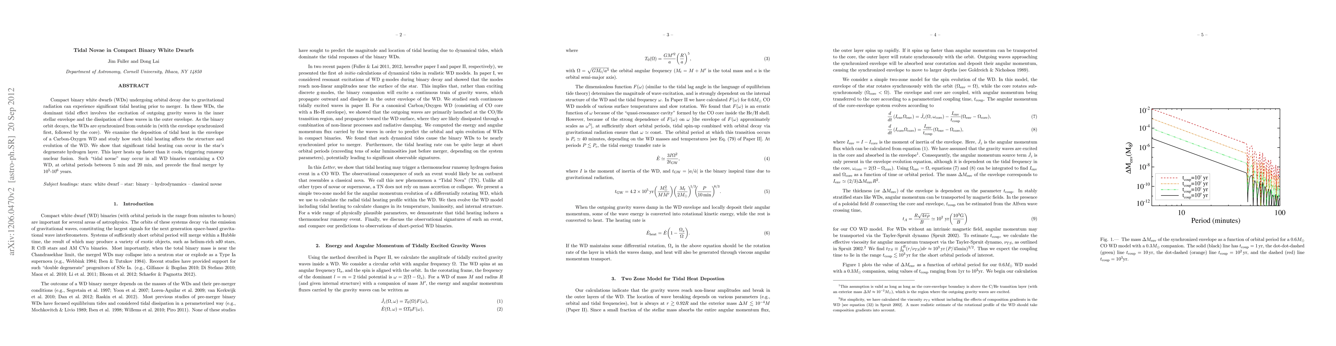 Compact binary white dwarfs (WDs) undergoing orbital decay due to gravitational radiation can experience significant tidal heating prior to merger. In these WDs, the dominant tidal effect involves the excitation of outgoing gravity waves in the inner stellar envelope and the dissipation of these waves in the outer envelope. As the binary orbit decays, the WDs are synchronized from outside in (with the envelope synchronized first, followed by the core). We examine the deposition of tidal heat in the envelope of a Carbon-Oxygen WD and study how such tidal heating affects the structure and evolution of the WD. We show that significant tidal heating can occur in the star's degenerate hydrogen layer. This layer heats up faster than it cools, triggering runaway nuclear fusion. Such "tidal novae" may occur in all WD binaries containing a CO WD, at orbital periods between 5 min and 20 min, and precede the final merger by 10^5-10^6 years.
