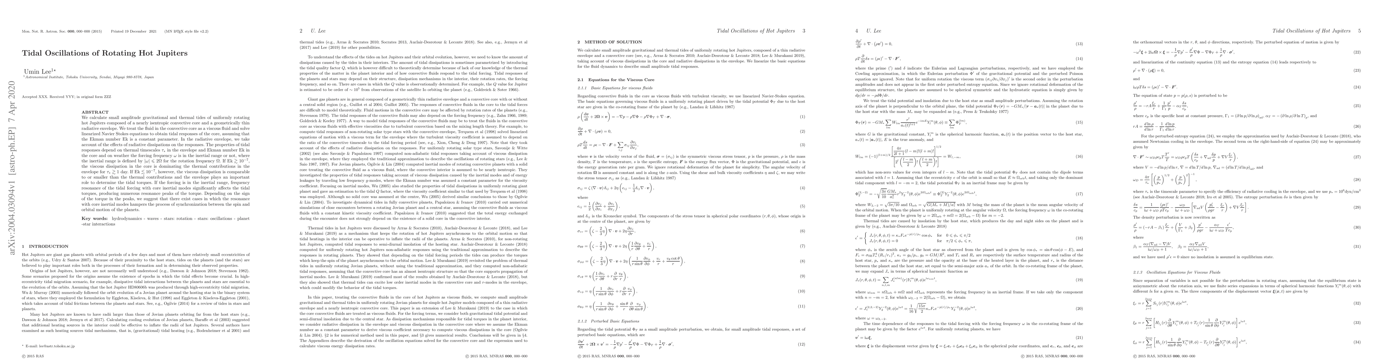 We calculate small amplitude gravitational and thermal tides of uniformly rotating hot Jupiters composed of a nearly isentropic convective core and a geometrically thin radiative envelope. We treat the fluid in the convective core as a viscous fluid and solve linearized Navier Stokes equations to obtain tidal responses of the core, assuming that the Ekman number ${\rm Ek}$ is a constant parameter. In the radiative envelope, we take account of the effects of radiative dissipations on the responses. The properties of tidal responses depend on thermal timescales $\tau_*$ in the envelope and Ekman number Ek in the core and on weather the forcing frequency $\omega$ is in the inertial range or not, where the inertial range is defined by $|\omega|\le2\Omega$ for the rotation frequency $\Omega$. If ${\rm Ek}\gtrsim 10^{-7}$, the viscous dissipation in the core is dominating the thermal contributions in the envelope for $\tau_*\gtrsim 1$ day. If ${\rm Ek}\lesssim 10^{-7}$, however, the viscous dissipation is comparable to or smaller than the thermal contributions and the envelope plays an important role to determine the tidal torques. If the forcing is in the inertial range, frequency resonance of the tidal forcing with core inertial modes significantly affects the tidal torques, producing numerous resonance peaks of the torque. Depending on the sign of the torque in the peaks, we suggest that there exist cases in which the resonance with core inertial modes hampers the process of synchronization between the spin and orbital motion of the planets.