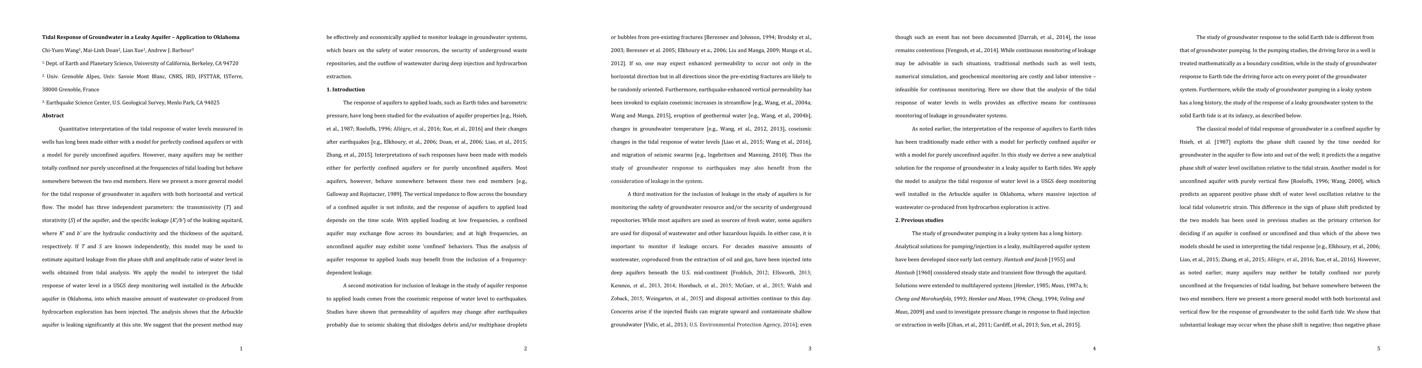 This paper develops a new model for tidal response in leaky aquifers, demonstrating its application to groundwater in Oklahoma's Arbuckle aquifer. The model estimates aquitard leakage using transmissivity, storativity, and specific leakage, revealing significant leakage at the study site.