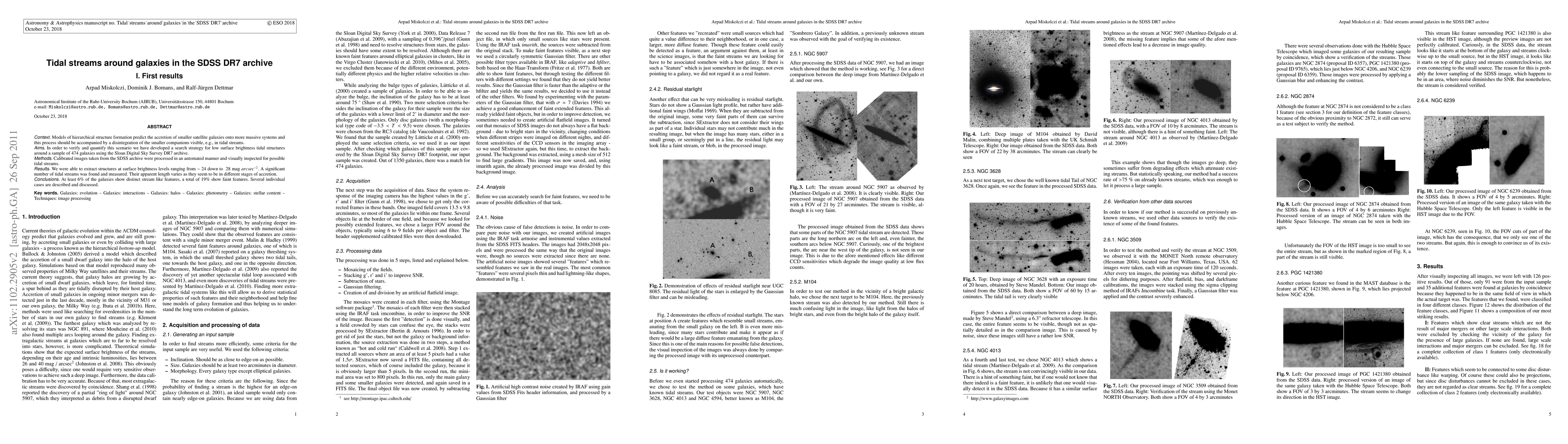 This study identifies and measures tidal streams around 474 galaxies from the SDSS DR7 archive, finding that at least 6% exhibit distinct stream-like features, while 19% show faint features, supporting models of hierarchical structure formation.