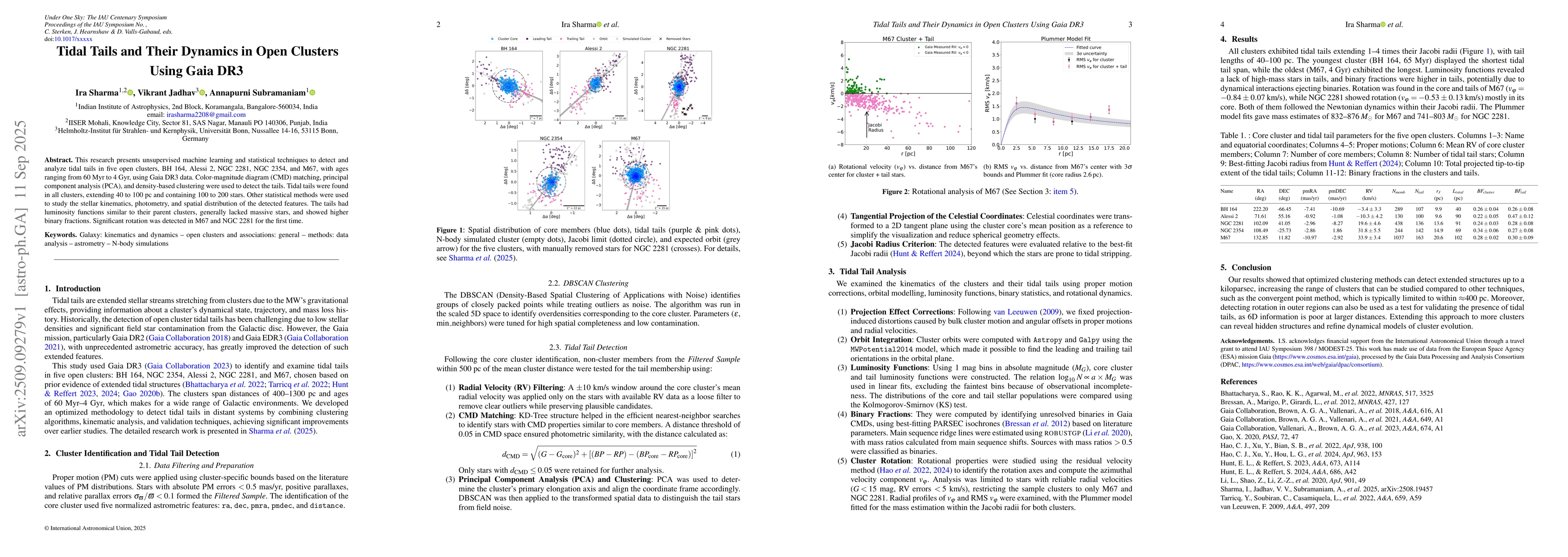 This research presents unsupervised machine learning and statistical techniques to detect and analyze tidal tails in five open clusters, BH 164, Alessi 2, NGC 2281, NGC 2354, and M67, with ages ranging from 60 Myr to 4 Gyr, using Gaia DR3 data. Color-magnitude diagram (CMD) matching, principal component analysis (PCA), and density-based clustering were used to detect the tails. Tidal tails were found in all clusters, extending 40 to 100 pc and containing 100 to 200 stars. Other statistical methods were used to study the stellar kinematics, photometry, and spatial distribution of the detected features. The tails had luminosity functions similar to their parent clusters, generally lacked massive stars, and showed higher binary fractions. Significant rotation was detected in M67 and NGC 2281 for the first time.