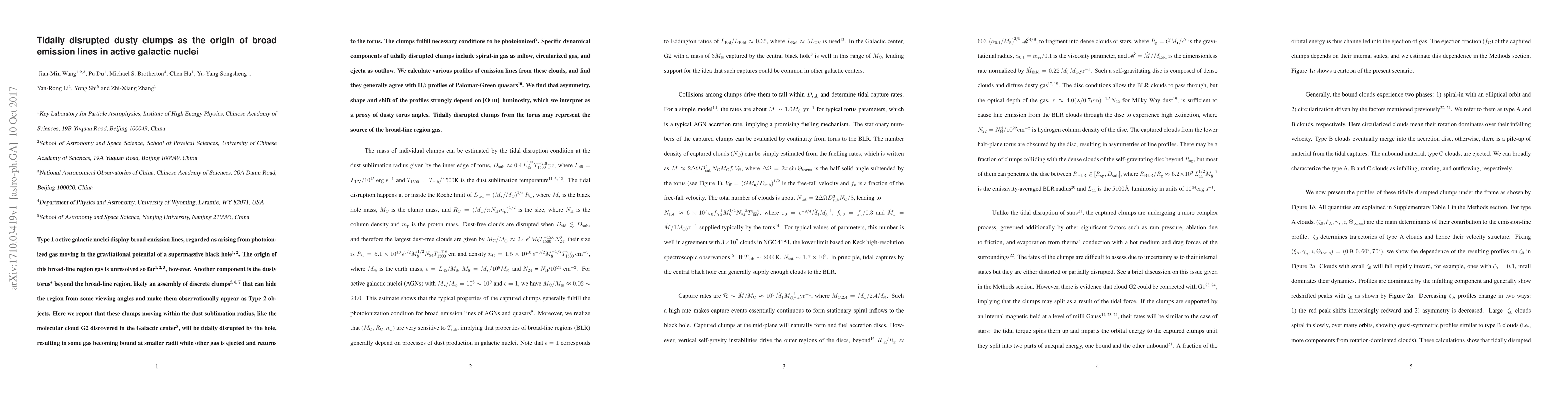 Type 1 active galactic nuclei display broad emission lines, regarded as arising from photoionized gas moving in the gravitational potential of a supermassive black hole. The origin of this broad-line region gas is unresolved so far, however. Another component is the dusty torus beyond the broad-line region, likely an assembly of discrete clumps that can hide the region from some viewing angles and make them observationally appear as Type 2 objects. Here we report that these clumps moving within the dust sublimation radius, like the molecular cloud G2 discovered in the Galactic center, will be tidally disrupted by the hole, resulting in some gas becoming bound at smaller radii while other gas is ejected and returns to the torus. The clumps fulfill necessary conditions to be photoionized. Specific dynamical components of tidally disrupted clumps include spiral-in gas as inflow, circularized gas, and ejecta as outflow. We calculate various profiles of emission lines from these clouds, and find they generally agree with H$\beta$ profiles of Palomar-Green quasars. We find that asymmetry, shape and shift of the profiles strongly depend on [O III], luminosity, which we interpret as a proxy of dusty torus angles. Tidally disrupted clumps from the torus may represent the source of the broad-line region gas.