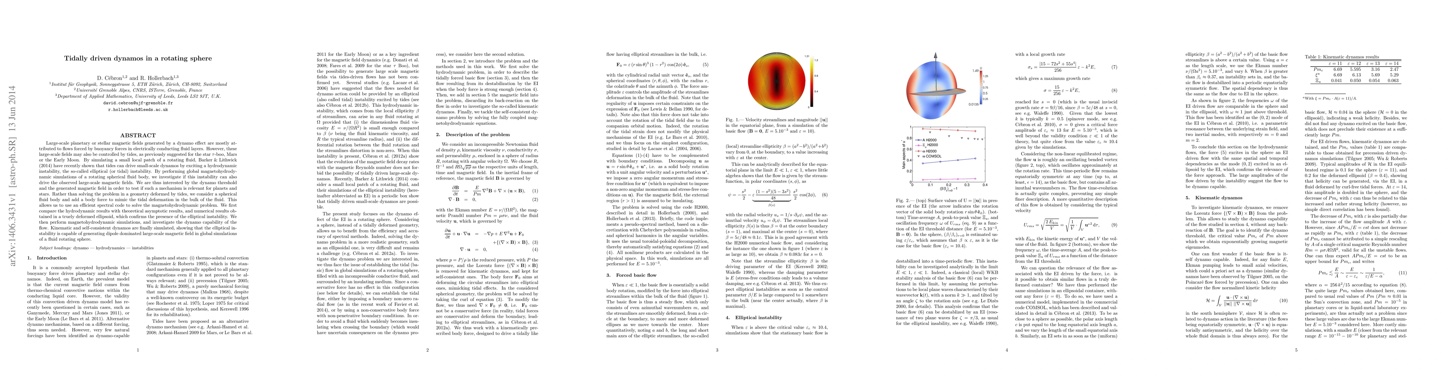 Large-scale planetary or stellar magnetic fields generated by a dynamo effect are mostly attributed to flows forced by buoyancy forces in electrically conducting fluid layers. However, these large-scale fields may also be controlled by tides, as previously suggested for the star $\tau$-boo, Mars or the Early Moon. By simulating a small local patch of a rotating fluid, \cite{Barker2014} have recently shown that tides can drive small-scale dynamos by exciting a hydrodynamic instability, the so-called elliptical (or tidal) instability. By performing global magnetohydrodynamic simulations of a rotating spherical fluid body, we investigate if this instability can also drive the observed large-scale magnetic fields. We are thus interested by the dynamo threshold and the generated magnetic field in order to test if such a mechanism is relevant for planets and stars. Rather than solving the problem in a geometry deformed by tides, we consider a spherical fluid body and add a body force to mimic the tidal deformation in the bulk of the fluid. This allows us to use an efficient spectral code to solve the magnetohydrodynamic problem. We first compare the hydrodynamic results with theoretical asymptotic results, and numerical results obtained in a truely deformed ellipsoid, which confirms the presence of the elliptical instability. We then perform magnetohydrodynamic simulations, and investigate the dynamo capability of the flow. Kinematic and self-consistent dynamos are finally simulated, showing that the elliptical instability is capable of generating dipole dominated large-scale magnetic field in global simulations of a fluid rotating sphere.