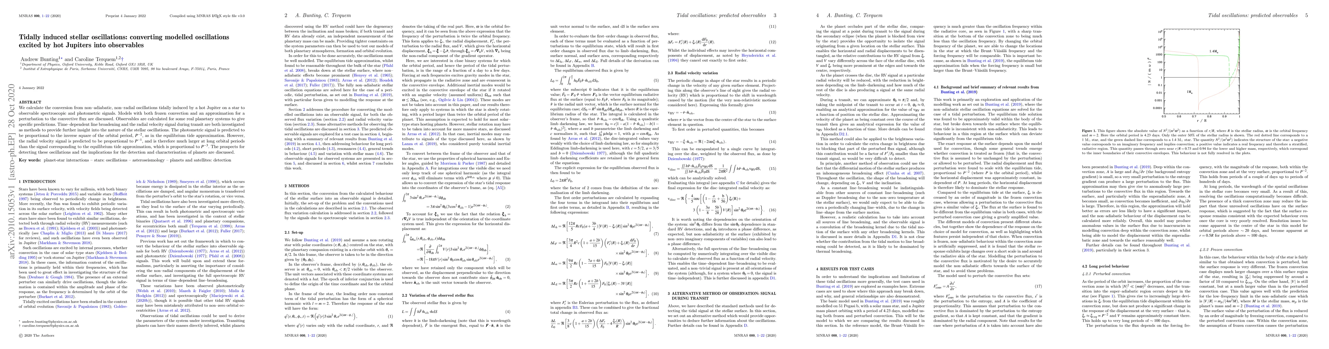 We calculate the conversion from non-adiabatic, non-radial oscillations tidally induced by a hot Jupiter on a star to observable spectroscopic and photometric signals. Models with both frozen convection and an approximation for a perturbation to the convective flux are discussed. Observables are calculated for some real planetary systems to give specific predictions. Time-dependent line broadening and the radial velocity signal during transit are both investigated as methods to provide further insight into the nature of the stellar oscillations. The photometric signal is predicted to be proportional to the inverse square of the orbital period, $P^{-2}$, as in the equilibrium tide approximation. However, the radial velocity signal is predicted to be proportional to $ P^{-1}$, and is therefore much larger at long orbital periods than the signal corresponding to the equilibrium tide approximation, which is proportional to $P^{-3}$. The prospects for detecting these oscillations and the implications for the detection and characterisation of planets are discussed.