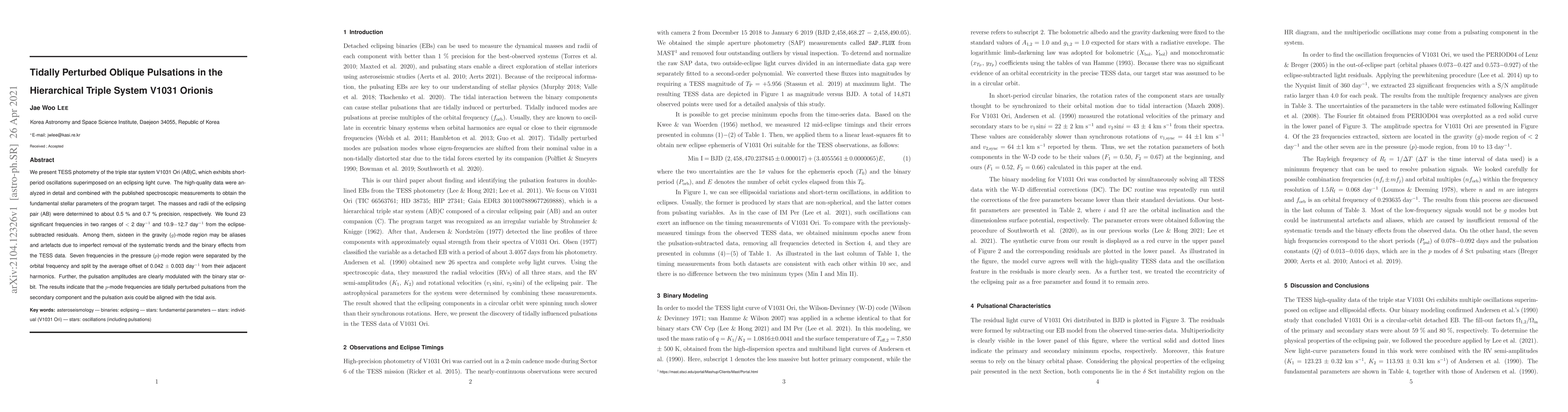 We present TESS photometry of the triple star system V1031 Ori (AB)C, which exhibits short-period oscillations superimposed on an eclipsing light curve. The high-quality data were analyzed in detail and combined with the published spectroscopic measurements to obtain the fundamental stellar parameters of the program target. The masses and radii of the eclipsing pair (AB) were determined to about 0.5 \% and 0.7 \% precision, respectively. We found 23 significant frequencies in two ranges of $<$ 2 day$^{-1}$ and 10.9$-$12.7 day$^{-1}$ from the eclipse-subtracted residuals. Among them, sixteen in the gravity ($g$)-mode region may be aliases and artefacts due to imperfect removal of the systematic trends and the binary effects from the TESS data. Seven frequencies in the pressure ($p$)-mode region were separated by the orbital frequency and split by the average offset of 0.042 $\pm$ 0.003 day$^{-1}$ from their adjacent harmonics. Further, the pulsation amplitudes are clearly modulated with the binary star orbit. The results indicate that the $p$-mode frequencies are tidally perturbed pulsations from the secondary component and the pulsation axis could be aligned with the tidal axis.