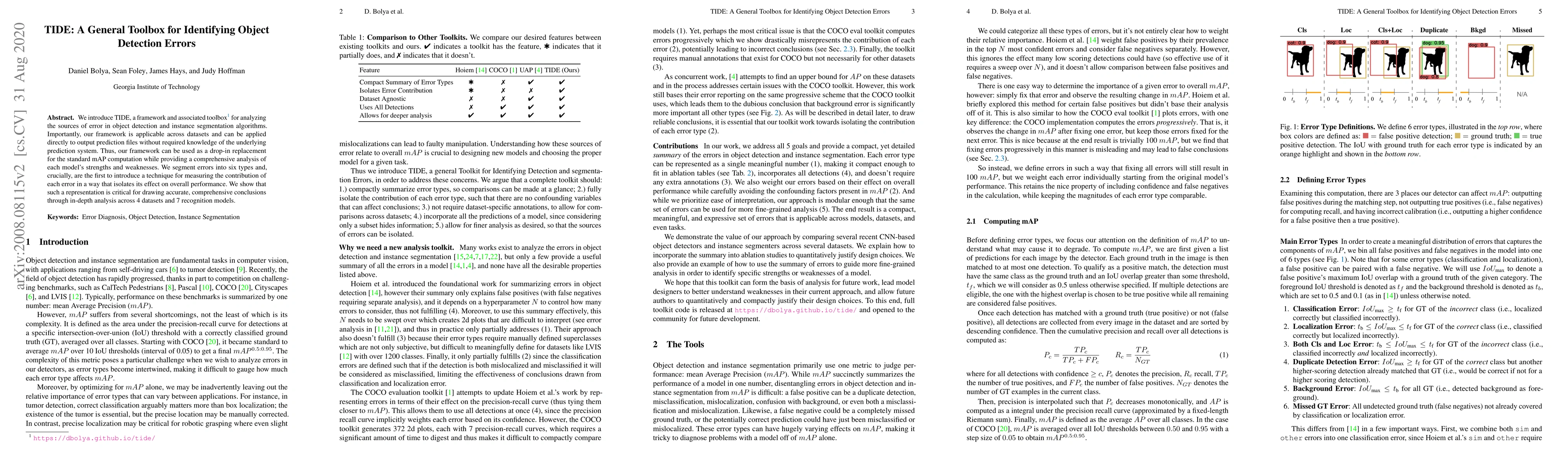 TIDE is a versatile toolbox for analyzing object detection and instance segmentation errors, applicable across different datasets without needing knowledge of the underlying prediction system. It segments errors into six types and introduces a method to measure each error's contribution, providing a detailed analysis of model performance across multiple datasets and models.