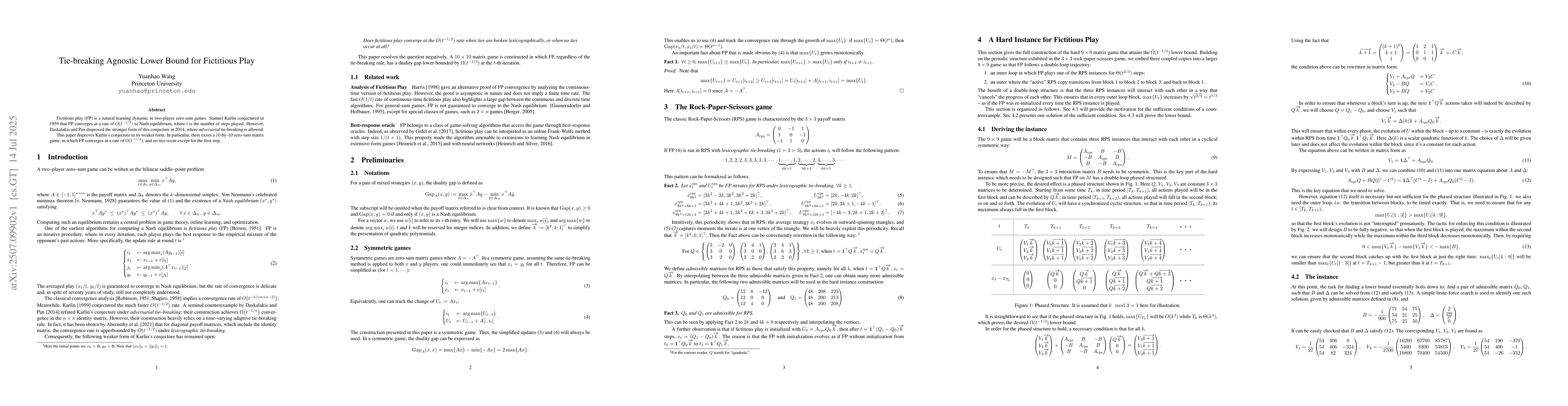 Fictitious play (FP) is a natural learning dynamic in two-player zero-sum games. Samuel Karlin conjectured in 1959 that FP converges at a rate of $O(t^{-1/2})$ to Nash equilibrium, where $t$ is the number of steps played. However, Daskalakis and Pan disproved the stronger form of this conjecture in 2014, where \emph{adversarial} tie-breaking is allowed. This paper disproves Karlin's conjecture in its weaker form. In particular, there exists a 10-by-10 zero-sum matrix game, in which FP converges at a rate of $\Omega(t^{-1/3})$, and no ties occur except for the first step.