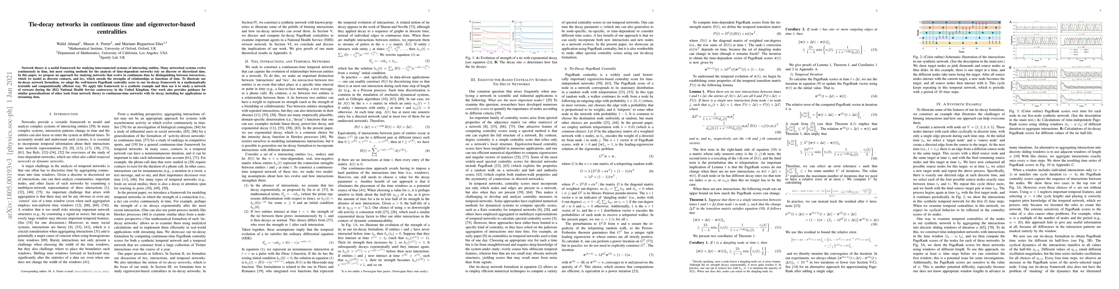 Network theory is a useful framework for studying interconnected systems of interacting entities. Many networked systems evolve continuously in time, but most existing methods for the analysis of time-dependent networks rely on discrete or discretized time. In this paper, we propose an approach for studying networks that evolve in continuous time by distinguishing between \emph{interactions}, which we model as discrete contacts, and \emph{ties}, which encode the strengths of relationships as functions of time. To illustrate our tie-decay network formalism, we adapt the well-known PageRank centrality score to our tie-decay framework in a mathematically tractable and computationally efficient way. We apply this framework to a synthetic example and then use it to study a network of retweets during the 2012 National Health Service controversy in the United Kingdom. Our work also provides guidance for similar generalizations of other tools from network theory to continuous-time networks with tie decay, including for applications to streaming data.