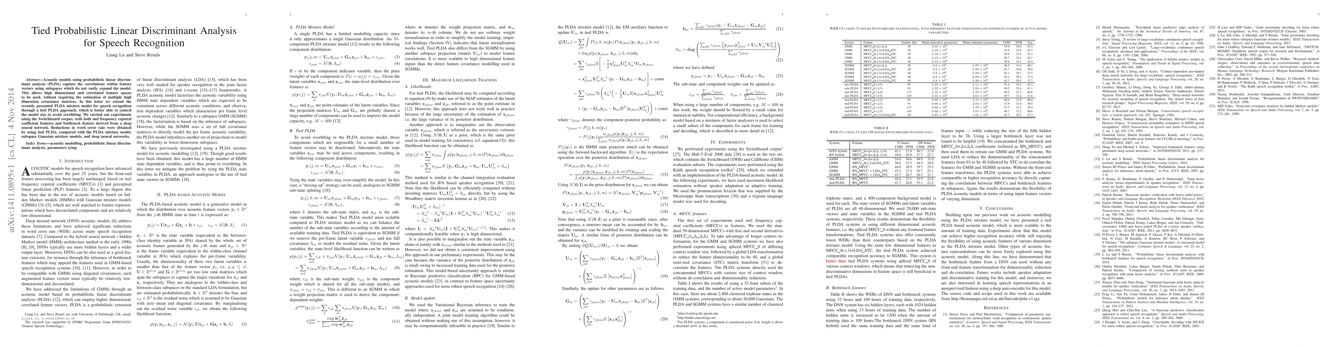 This paper proposes a tied probabilistic linear discriminant analysis (PLDA) approach to enhance speech recognition models, achieving reductions in word error rates compared to PLDA mixture models, subspace Gaussian mixture models, and deep neural networks, while controlling model size to prevent overfitting. Experiments on the Switchboard corpus using mel frequency cepstral coefficients and deep neural network features demonstrated the effectiveness of the tied PLDA method.
