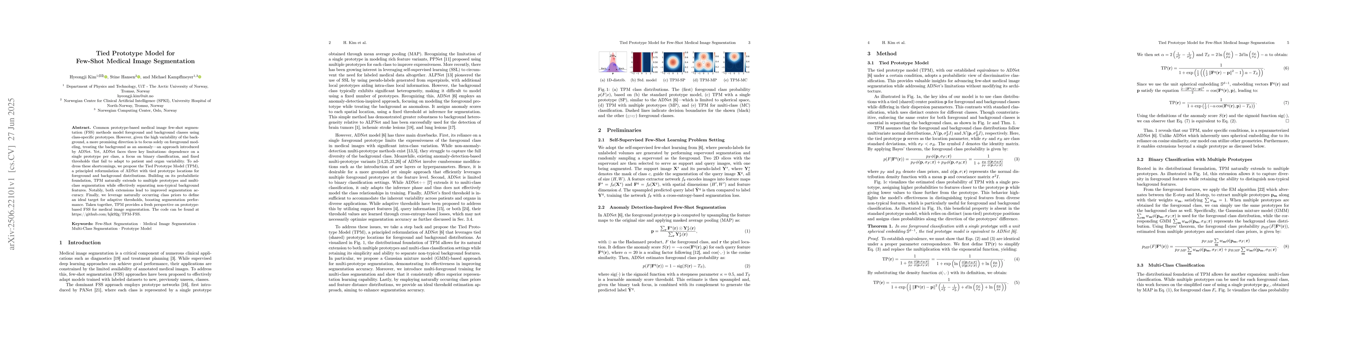 Common prototype-based medical image few-shot segmentation (FSS) methods model foreground and background classes using class-specific prototypes. However, given the high variability of the background, a more promising direction is to focus solely on foreground modeling, treating the background as an anomaly -- an approach introduced by ADNet. Yet, ADNet faces three key limitations: dependence on a single prototype per class, a focus on binary classification, and fixed thresholds that fail to adapt to patient and organ variability. To address these shortcomings, we propose the Tied Prototype Model (TPM), a principled reformulation of ADNet with tied prototype locations for foreground and background distributions. Building on its probabilistic foundation, TPM naturally extends to multiple prototypes and multi-class segmentation while effectively separating non-typical background features. Notably, both extensions lead to improved segmentation accuracy. Finally, we leverage naturally occurring class priors to define an ideal target for adaptive thresholds, boosting segmentation performance. Taken together, TPM provides a fresh perspective on prototype-based FSS for medical image segmentation. The code can be found at https://github.com/hjk92g/TPM-FSS.