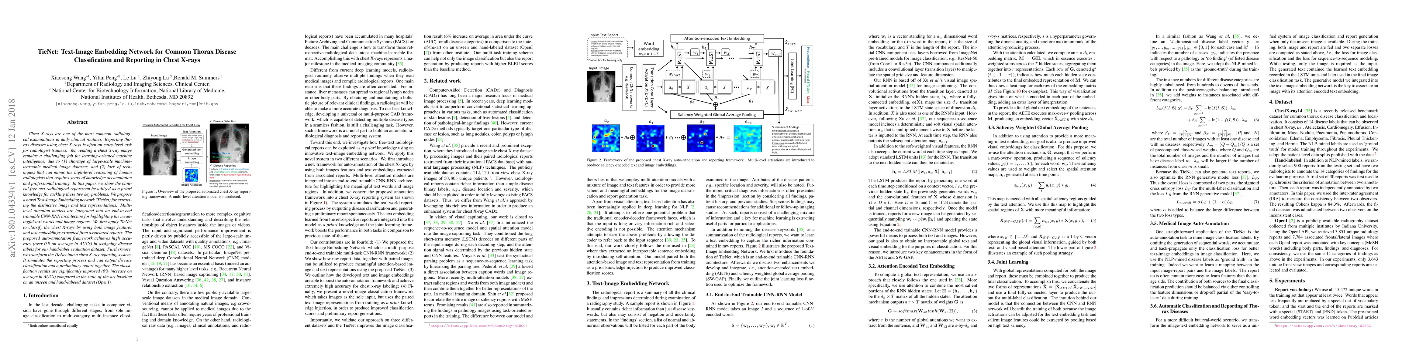 The TieNet model integrates text-image embeddings to classify common thoracic diseases in chest X-rays, leveraging clinical reports as a priori knowledge. It achieves high classification accuracy and improves reporting by simulating radiologists' reasoning, outperforming state-of-the-art baselines.