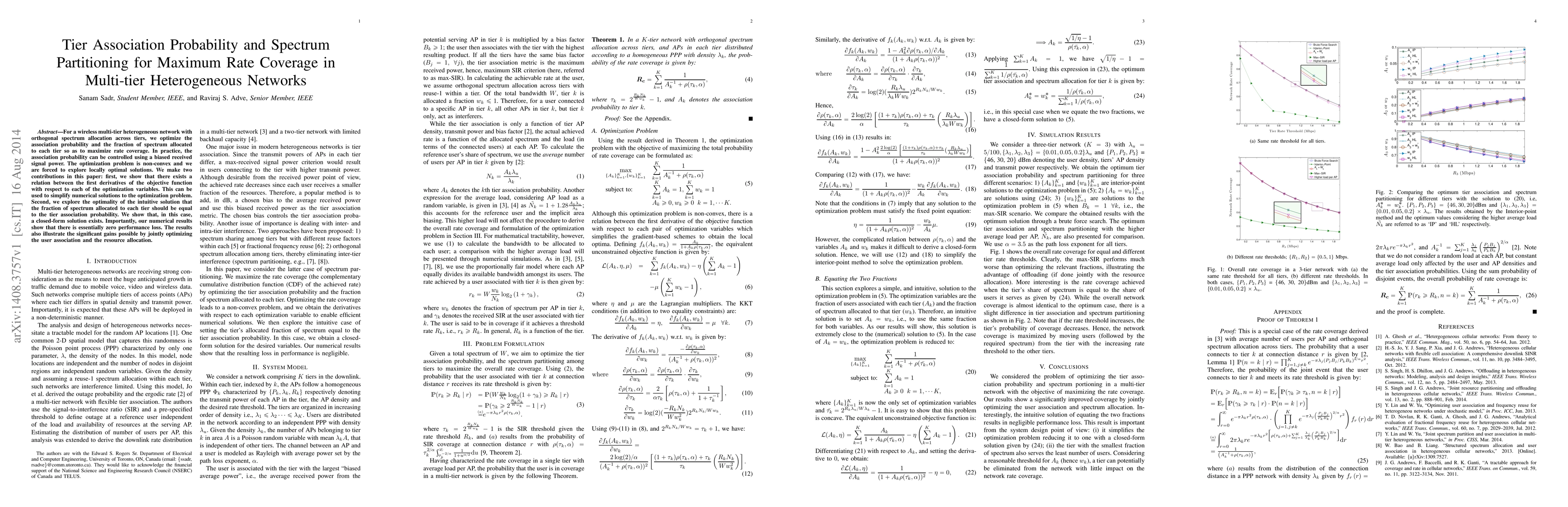 This paper optimizes association probability and spectrum partitioning in multi-tier heterogeneous networks to maximize rate coverage. It simplifies the non-convex optimization problem by revealing a relationship between the first derivatives of the objective function and demonstrates that equal spectrum allocation to each tier correlates with its association probability, yielding a closed-form solution with negligible performance loss.