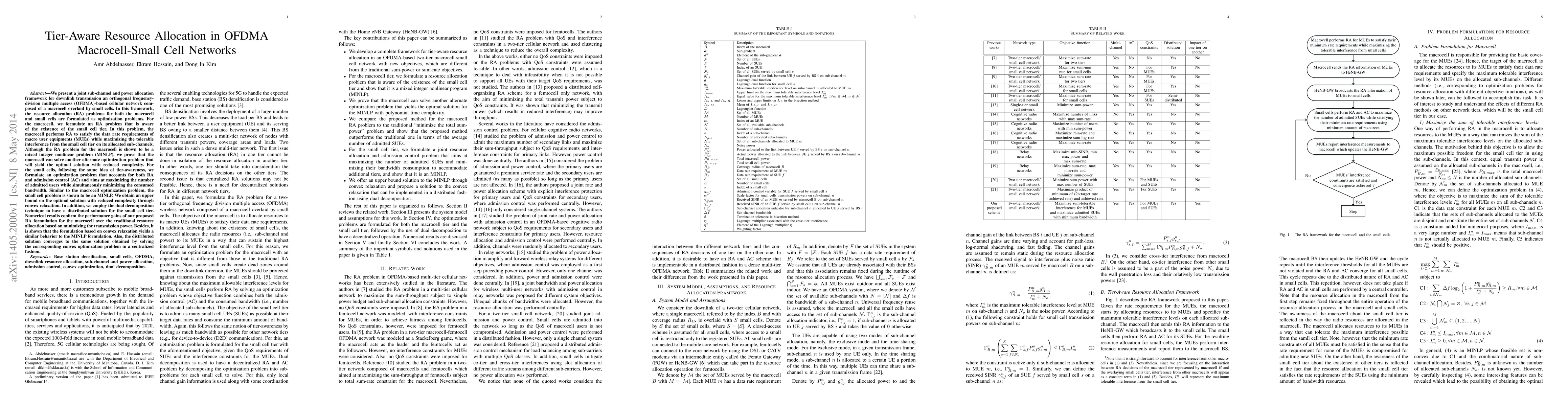 We present a joint sub-channel and power allocation framework for downlink transmission an orthogonal frequency-division multiple access (OFDMA)-based cellular network composed of a macrocell overlaid by small cells. In this framework, the resource allocation (RA) problems for both the macrocell and small cells are formulated as optimization problems. Numerical results confirm the performance gains of our proposed RA formulation for the macrocell over the traditional resource allocation based on minimizing the transmission power. Besides, it is shown that the formulation based on convex relaxation yields a similar behavior to the MINLP formulation. Also, the distributed solution converges to the same solution obtained by solving the corresponding convex optimization problem in a centralized fashion.
