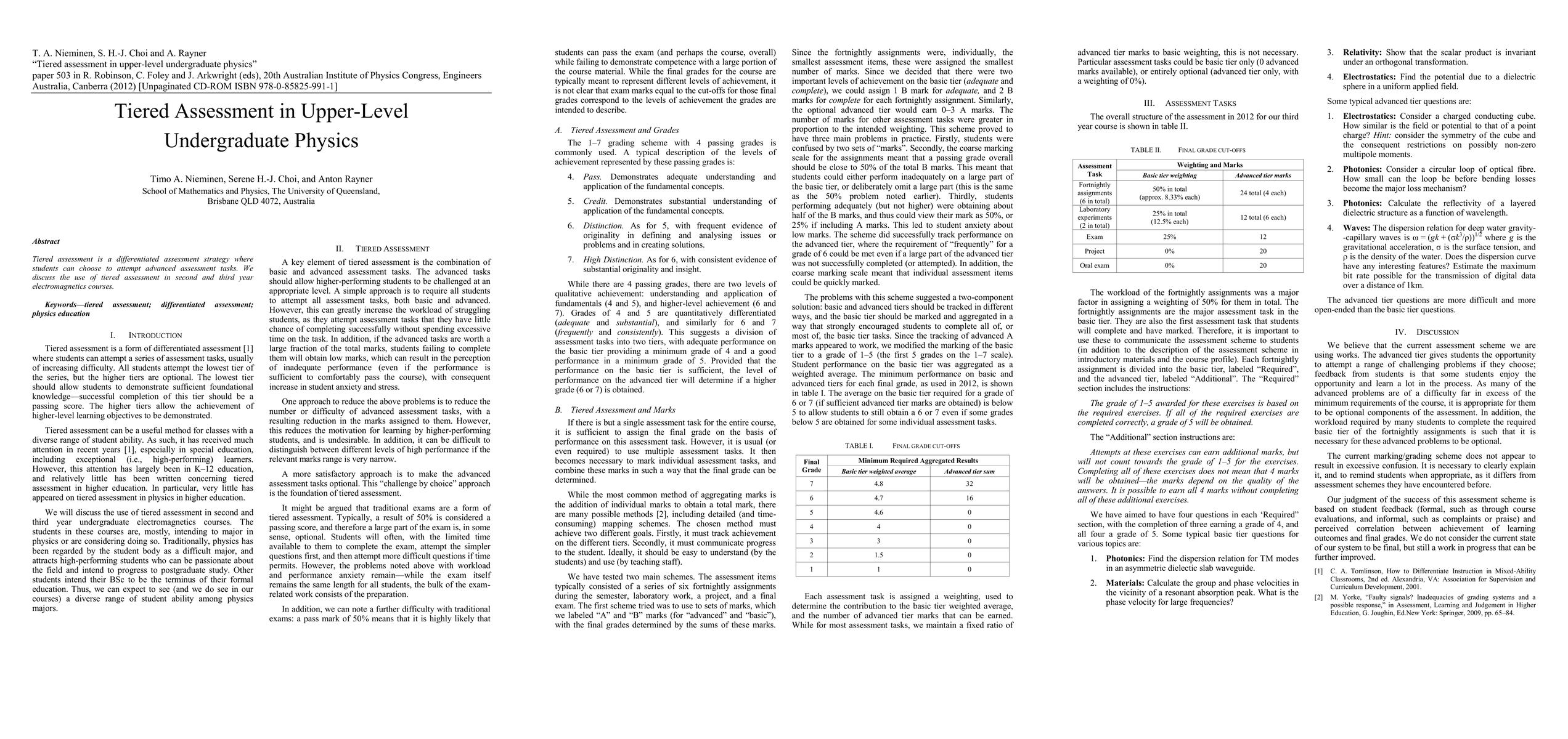 Tiered assessment is a differentiated assessment strategy where students can choose to attempt advanced assessment tasks. We discuss the use of tiered assessment in second and third year electromagnetics courses.