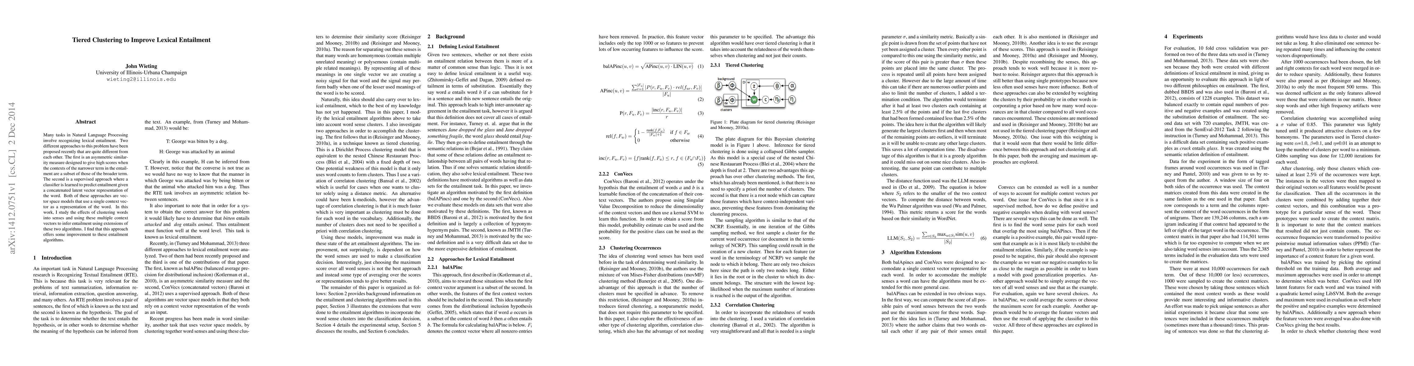 This paper explores the use of tiered clustering to enhance lexical entailment recognition in NLP by employing multiple context vectors derived from sense clustering. The study finds that this method improves upon existing single-vector models, particularly when applied to both asymmetric similarity measures and supervised classification approaches.