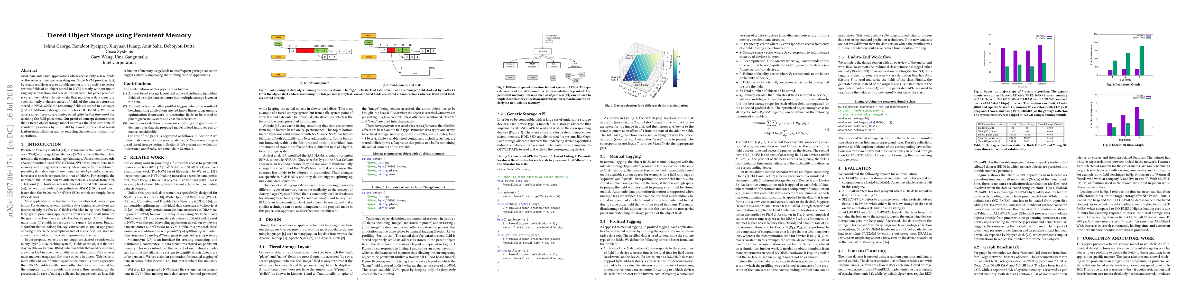 This paper proposes a tiered object storage model utilizing persistent memory (NVM) for fast access to frequently used object fields, while storing less accessed fields in cheaper traditional storage. The model employs a linear-programming optimization framework to determine field placement, achieving up to 50% improvement in operation execution time.