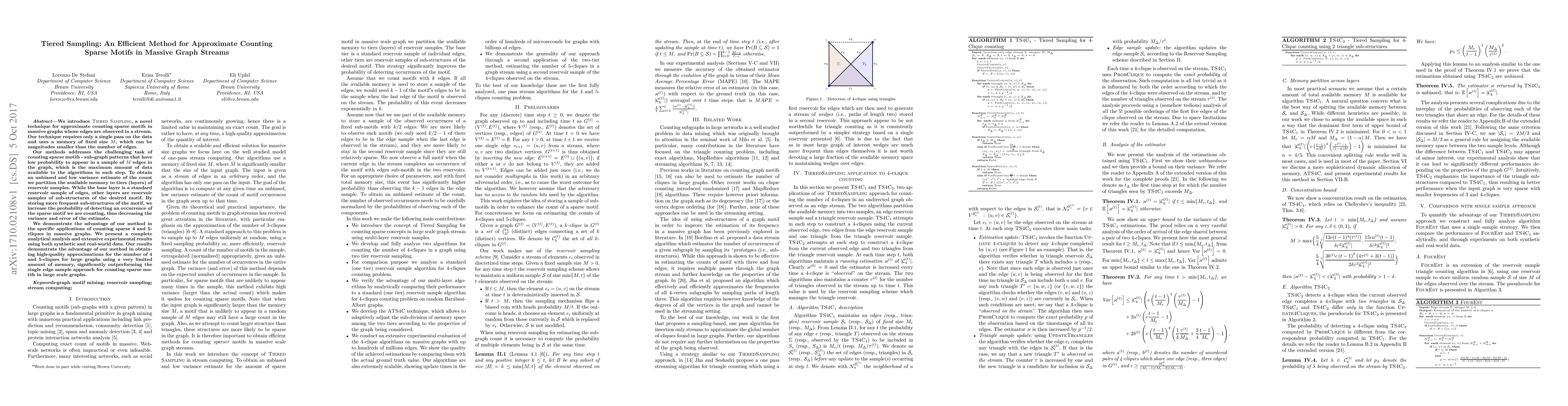 Tiered Sampling is a novel technique for efficiently counting sparse motifs in massive graph streams using a single pass and fixed memory size. It partitions memory into tiers of reservoir samples, increasing the probability of detecting sparse motifs and improving the accuracy of the count estimates.