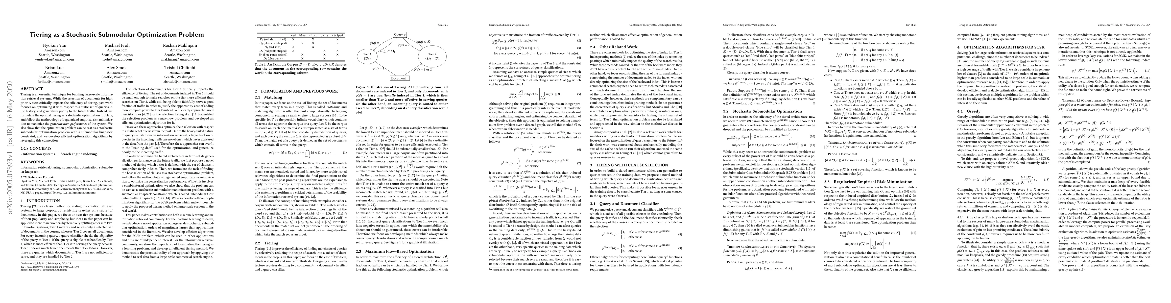 The paper formulates optimal tiering for large-scale information retrieval systems as a stochastic submodular optimization problem, leveraging regularized empirical risk minimization to improve generalization performance. It develops efficient optimization algorithms through the connection with a submodular knapsack constraint.