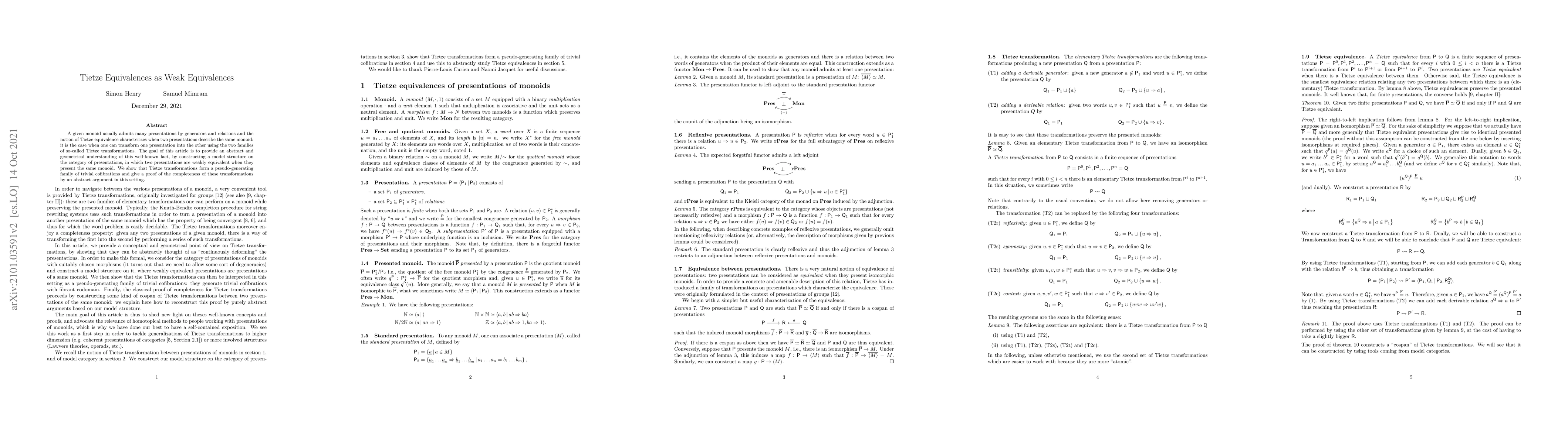 A given monoid usually admits many presentations by generators and relations and the notion of Tietze equivalence characterizes when two presentations describe the same monoid: it is the case when one can transform one presentation into the other using the two families of so-called Tietze transformations. The goal of this article is to provide an abstract and geometrical understanding of this well-known fact, by constructing a model structuree on the category of presentations, in which two presentations are weakly equivalent when they present the same monoid. We show that Tietze transformations form a pseudo-generating family of trivial cofibrations and give a proof of the completeness of these transformations by an abstract argument in this setting.